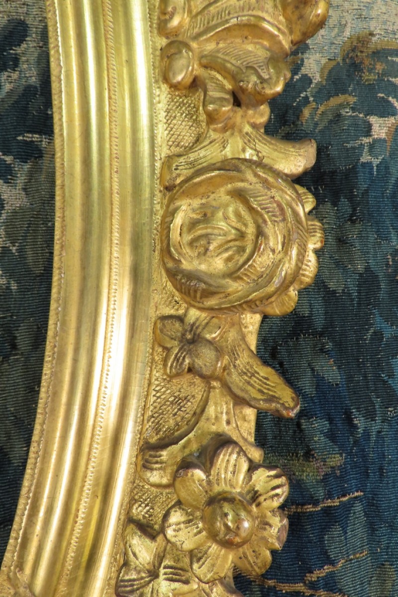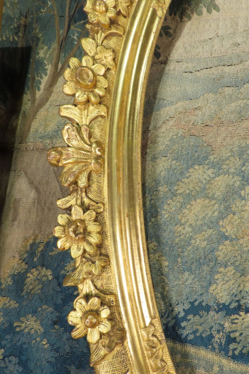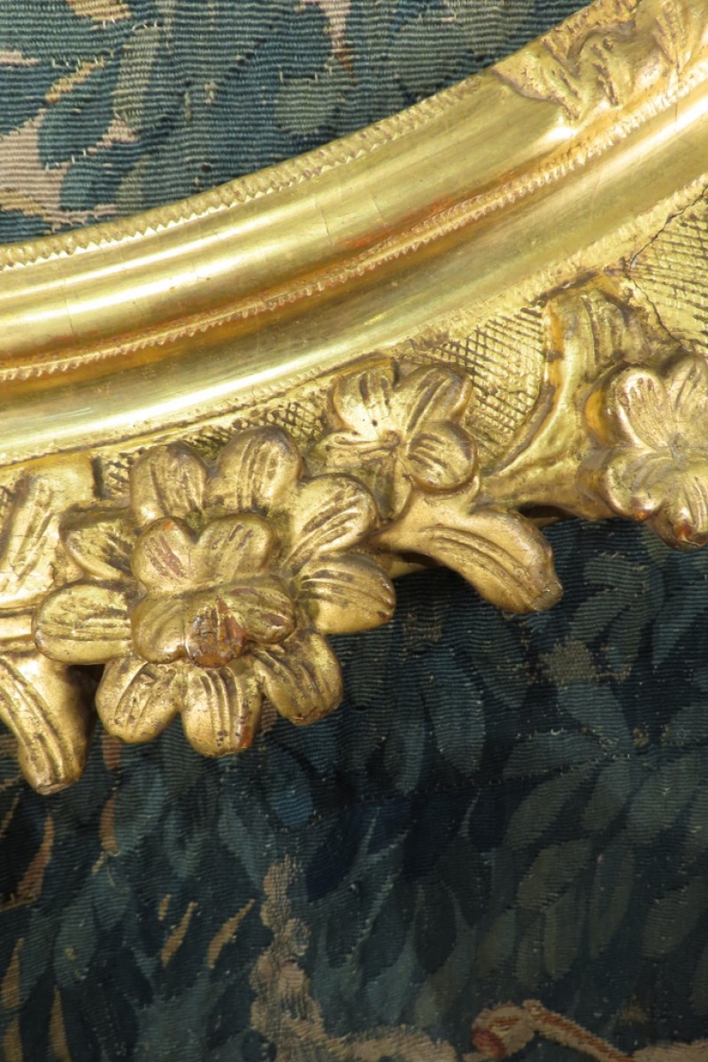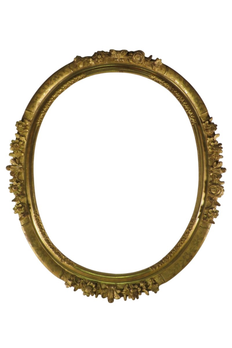 Grand cadre ovale en bois sculpté et doré à la feuille, à décor de palmettes, fleurs et feuillages. Cadre monté avec des chevilles. Il a conservé sa dorure d’origine avec des manques sur une coquille et fleurs. Présence de fentes du au travail du bois qui ne fragilise pas le cadre. Cadre d’époque XVIII ème, Louis XV.