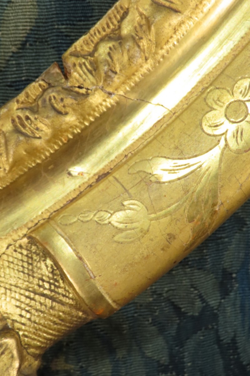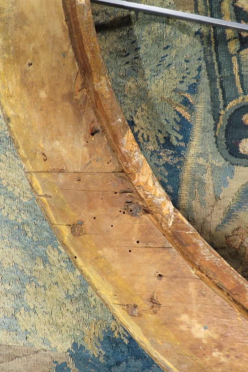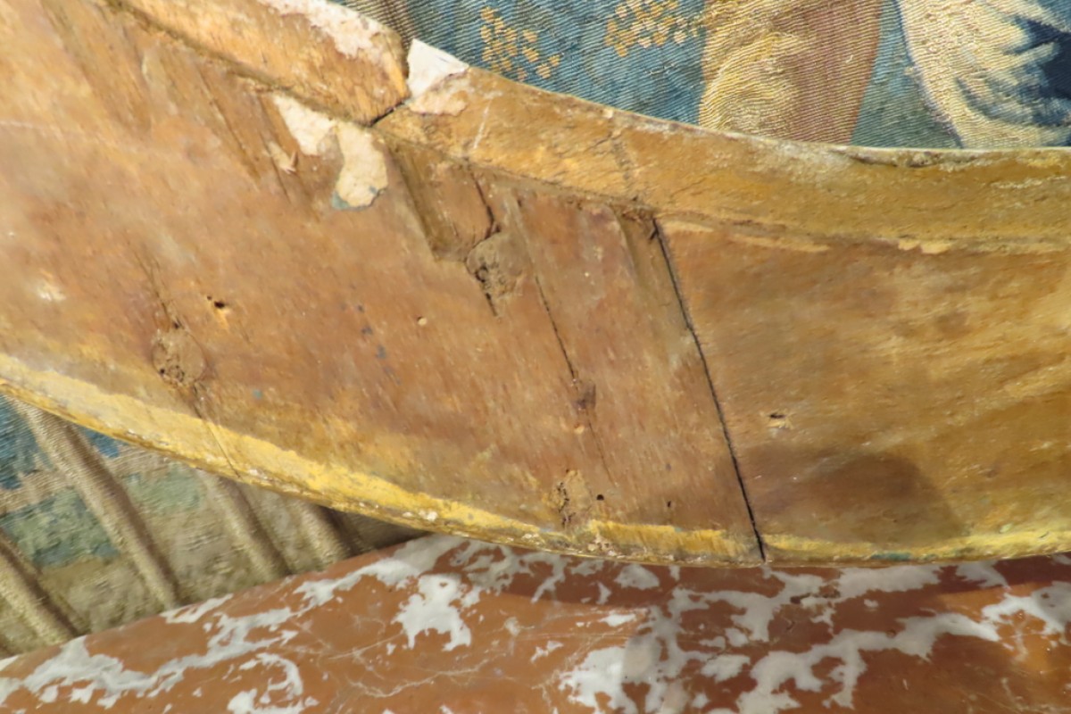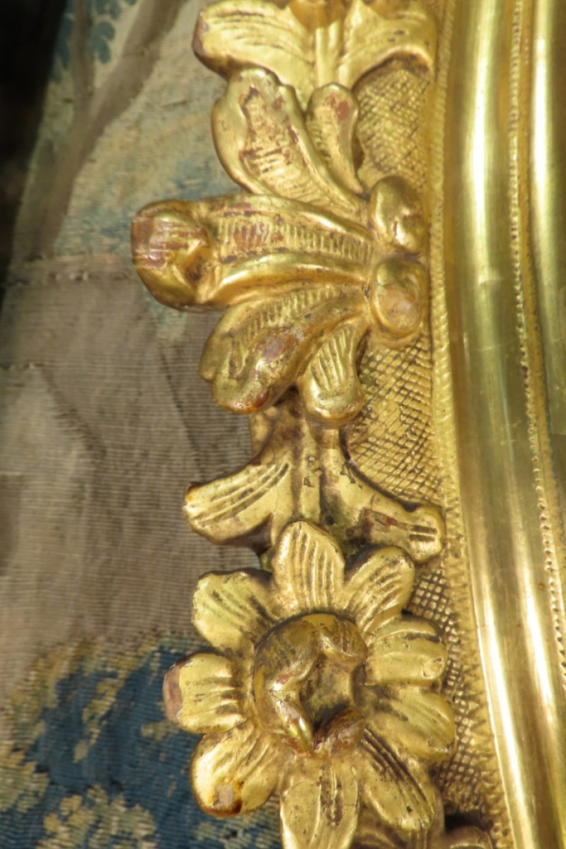 Grand cadre ovale en bois sculpté et doré à la feuille, à décor de palmettes, fleurs et feuillages. Cadre monté avec des chevilles. Il a conservé sa dorure d’origine avec des manques sur une coquille et fleurs. Présence de fentes du au travail du bois qui ne fragilise pas le cadre. Cadre d’époque XVIII ème, Louis XV.