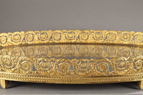 Grand centre de table d'époque Restauration en bronze doré reposant sur quatre pieds ornés de volutes et de pétales stylisées. La base ovale recouverte d'un miroir est ourlée d'une frise ajourée, finement ciselée de rinceaux feuillagés agrémentés de fleurs, de graines et des épis de blé, surmontant une couronne de lauriers. Très belle qualité de la ciselure et grande finesse dans le traitement des détails. Quelques tâches de rouille sur le miroir.