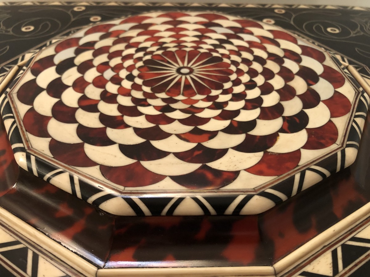 Le dessus est orné d'une grande rosace en relief composée d'écailles rouges et d'ivoire.