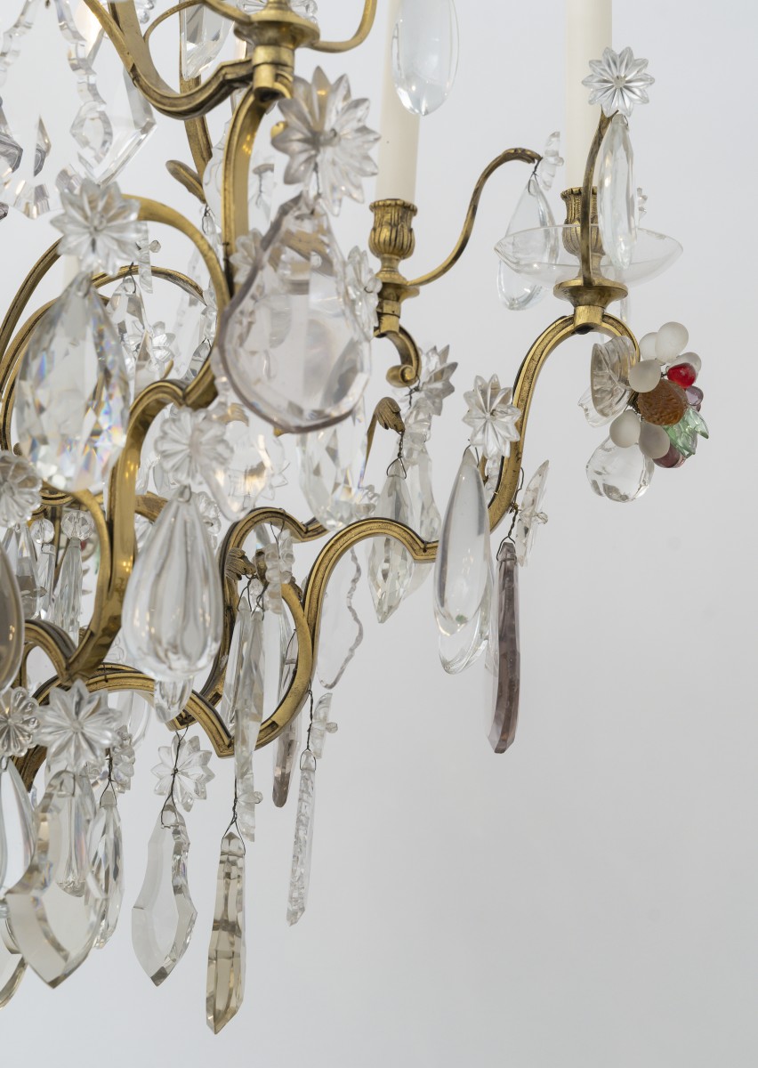Réalisé en bronze doré dans le style Louis XV, il est richement décoré de pampilles en cristal taillé, cristal fumé et cristal de roche. Des pampilles représentant différentes compositions de fruits rendent ce lustre particulièrement original.