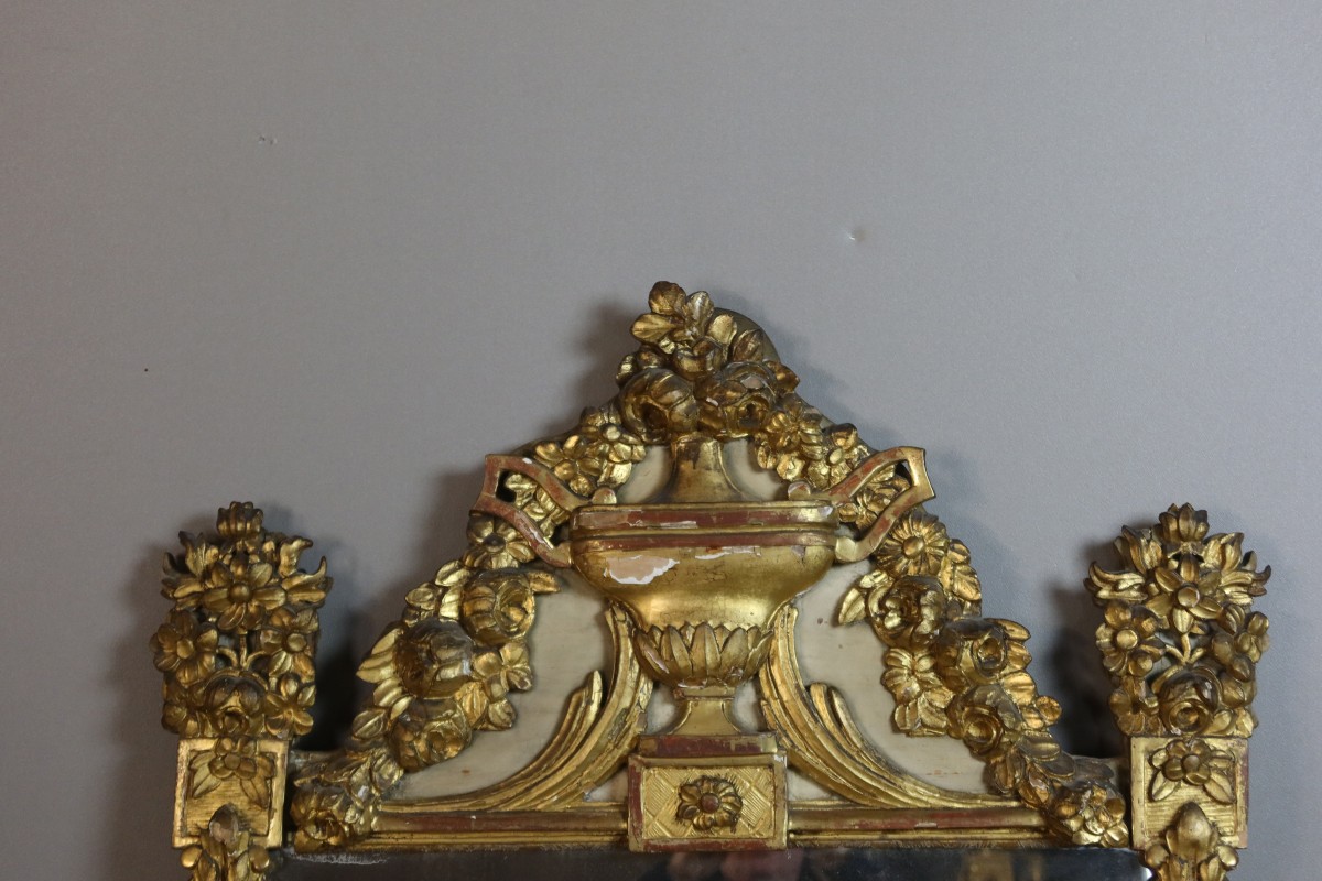 Grand miroir en bois doré sculpté de la fin du XVIIIème siècle. Il présente une urne sur le sommet