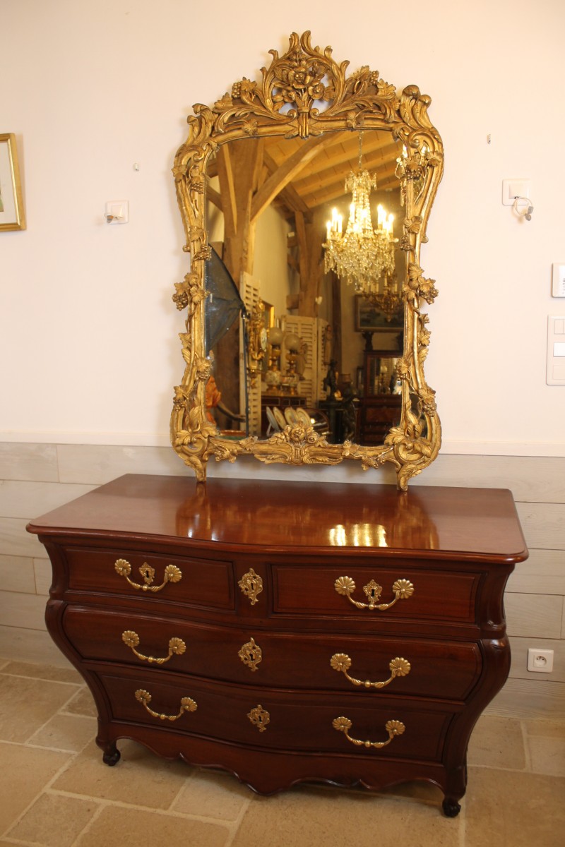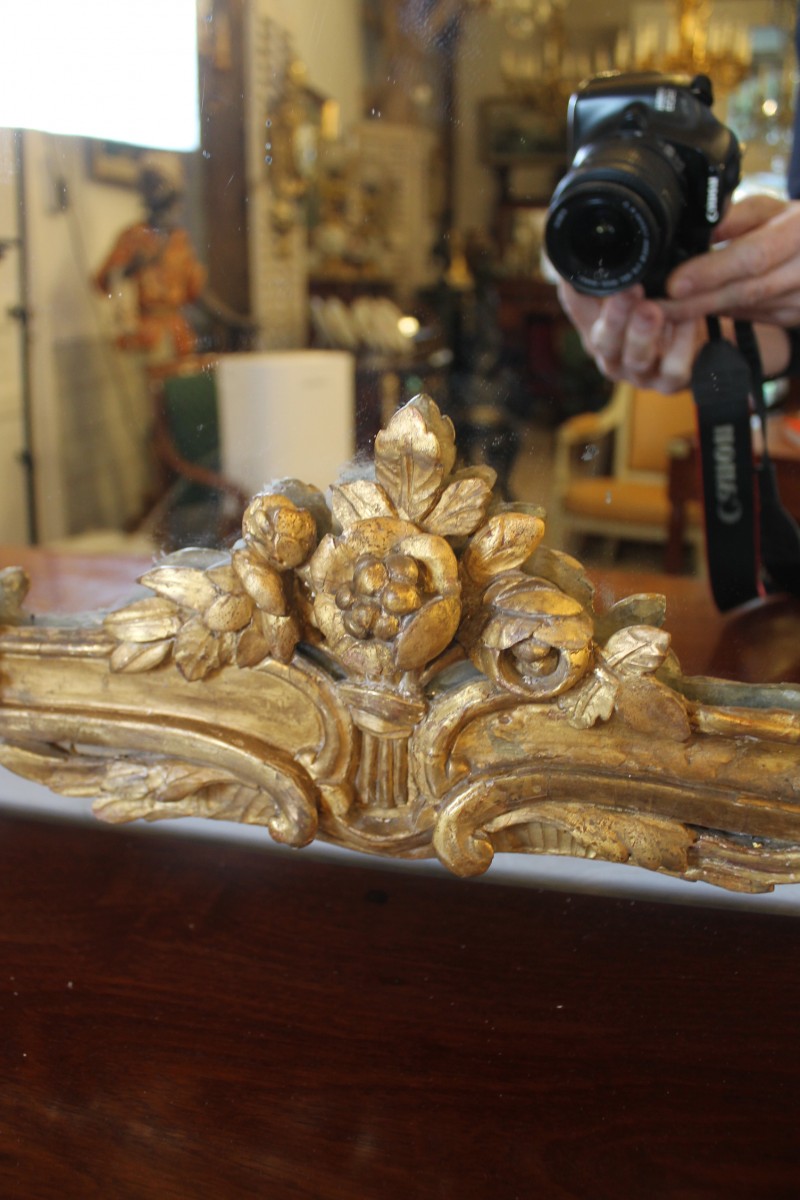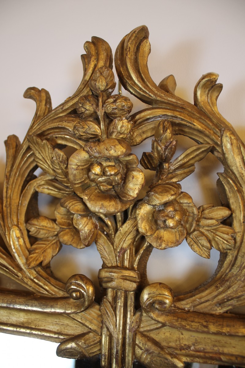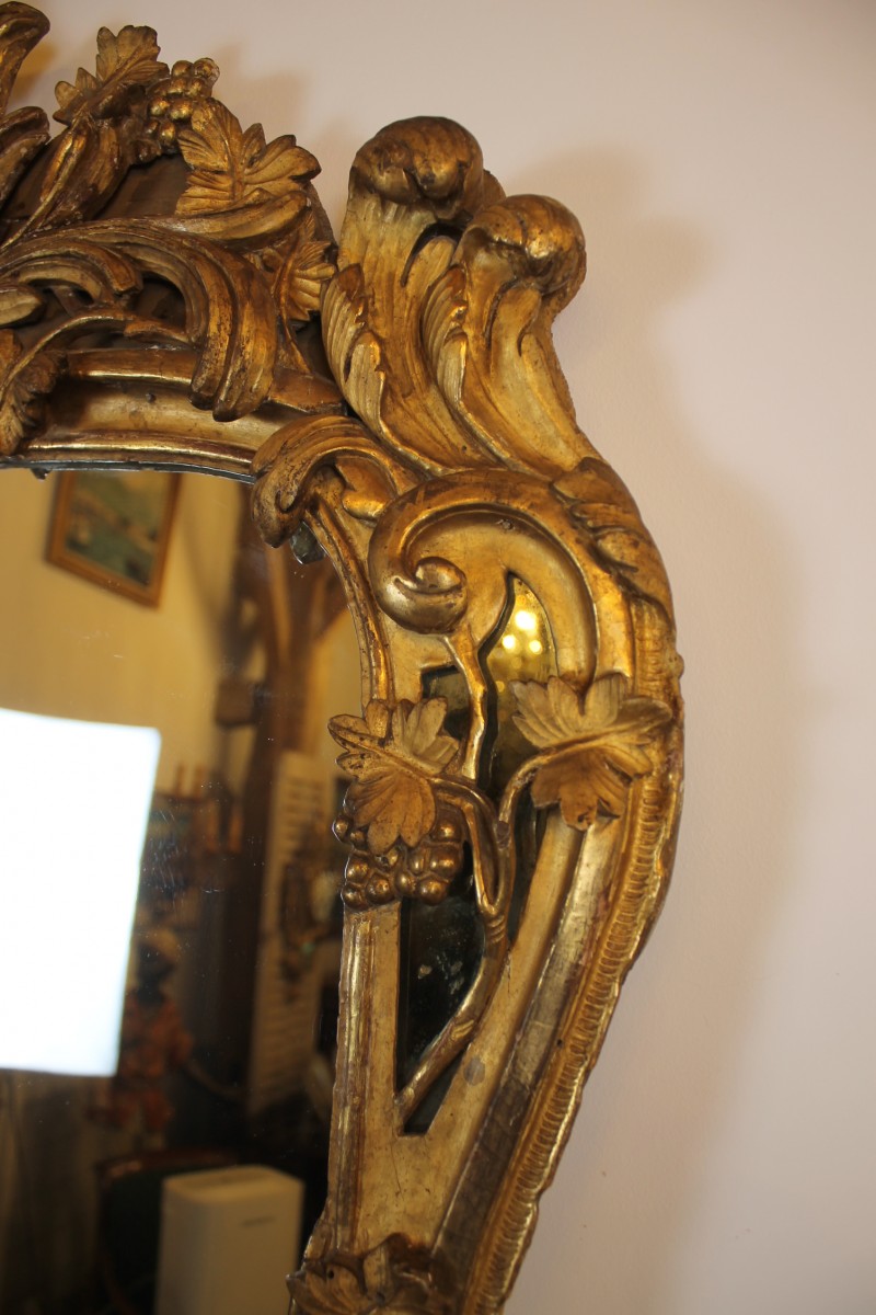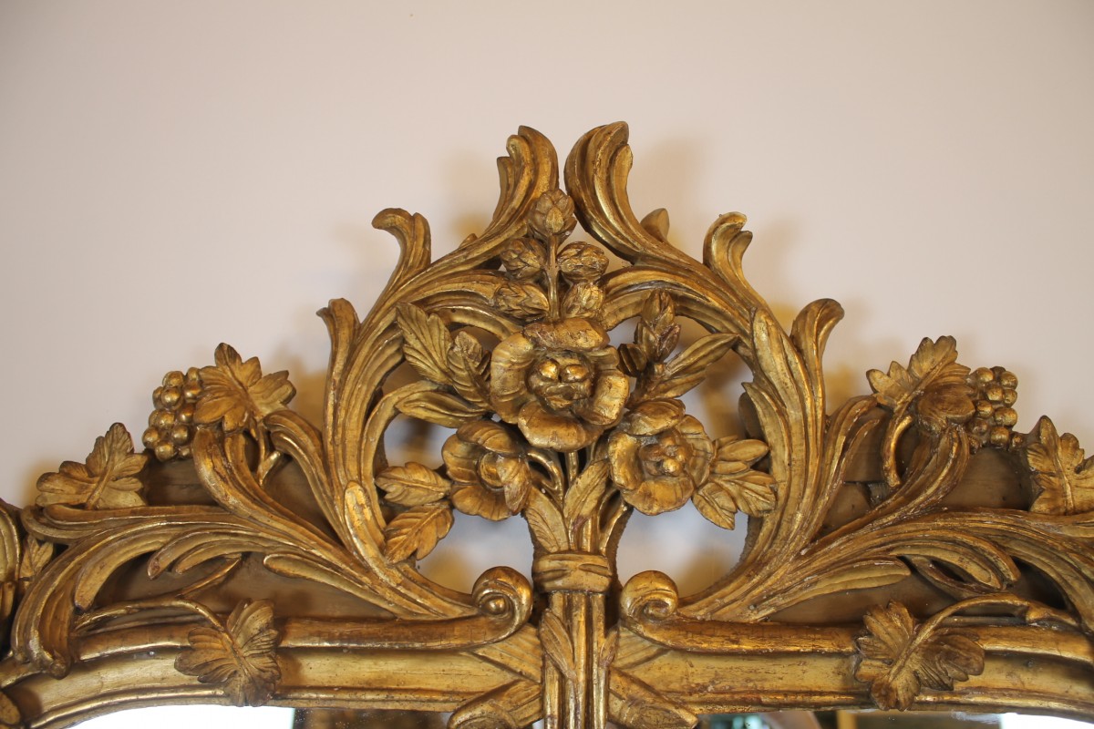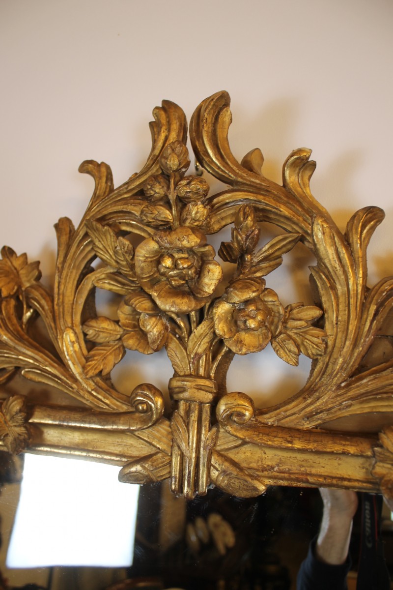 Grand miroir à parecloses en bois sculpté et doré à décor de rinceaux et de pampres, fronton à la gerbe fleurie.