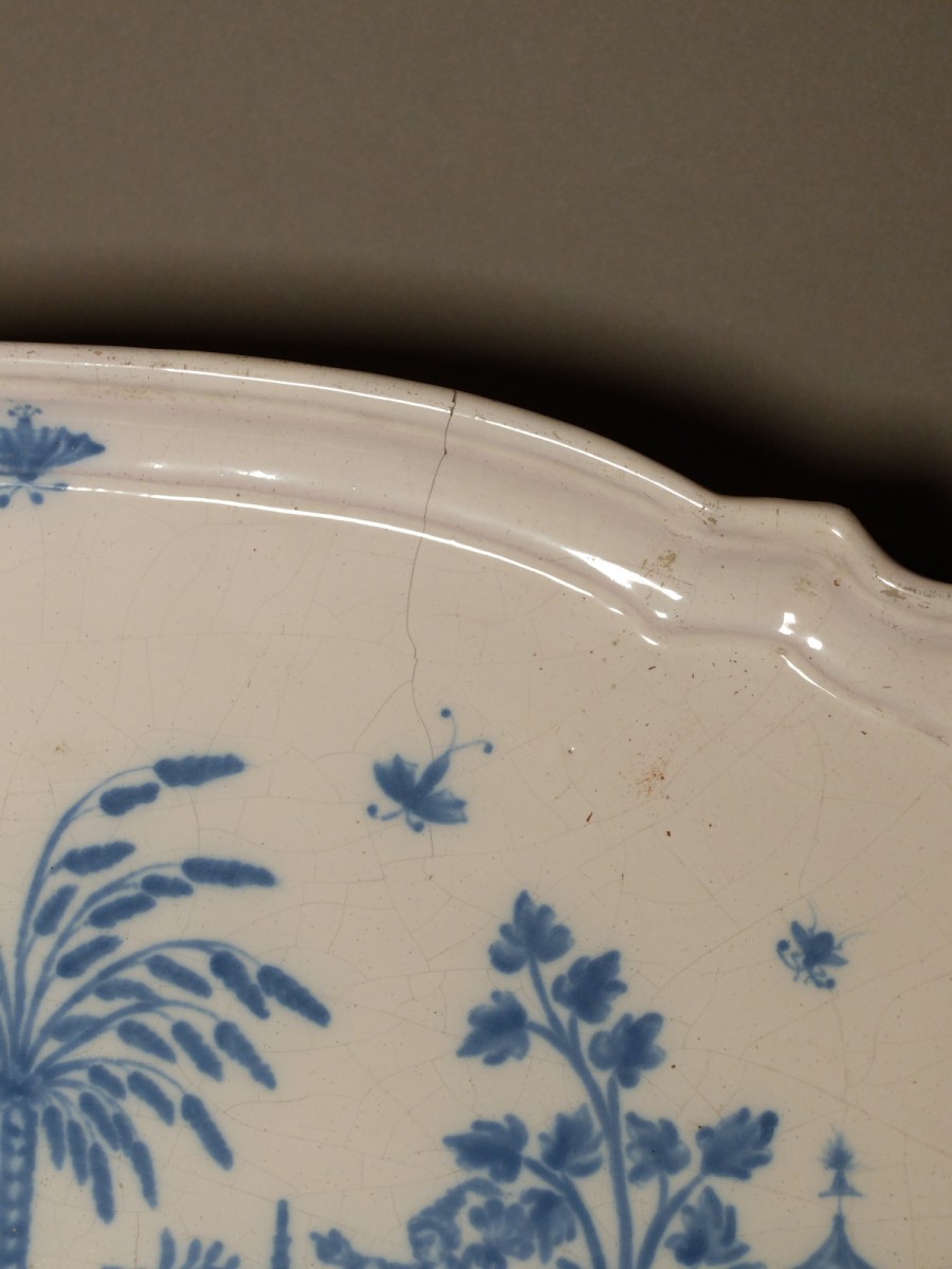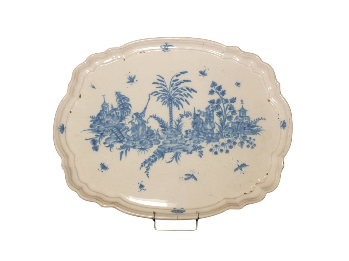 Grand plateau de service, à bord chantourné, mouluré, et à décor bleu sur fond blanc de plusieurs chinois sur un tertre, affairés dans un décor de végétation encadré d'architectures.