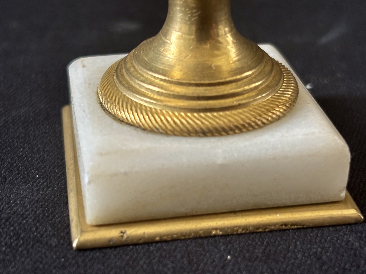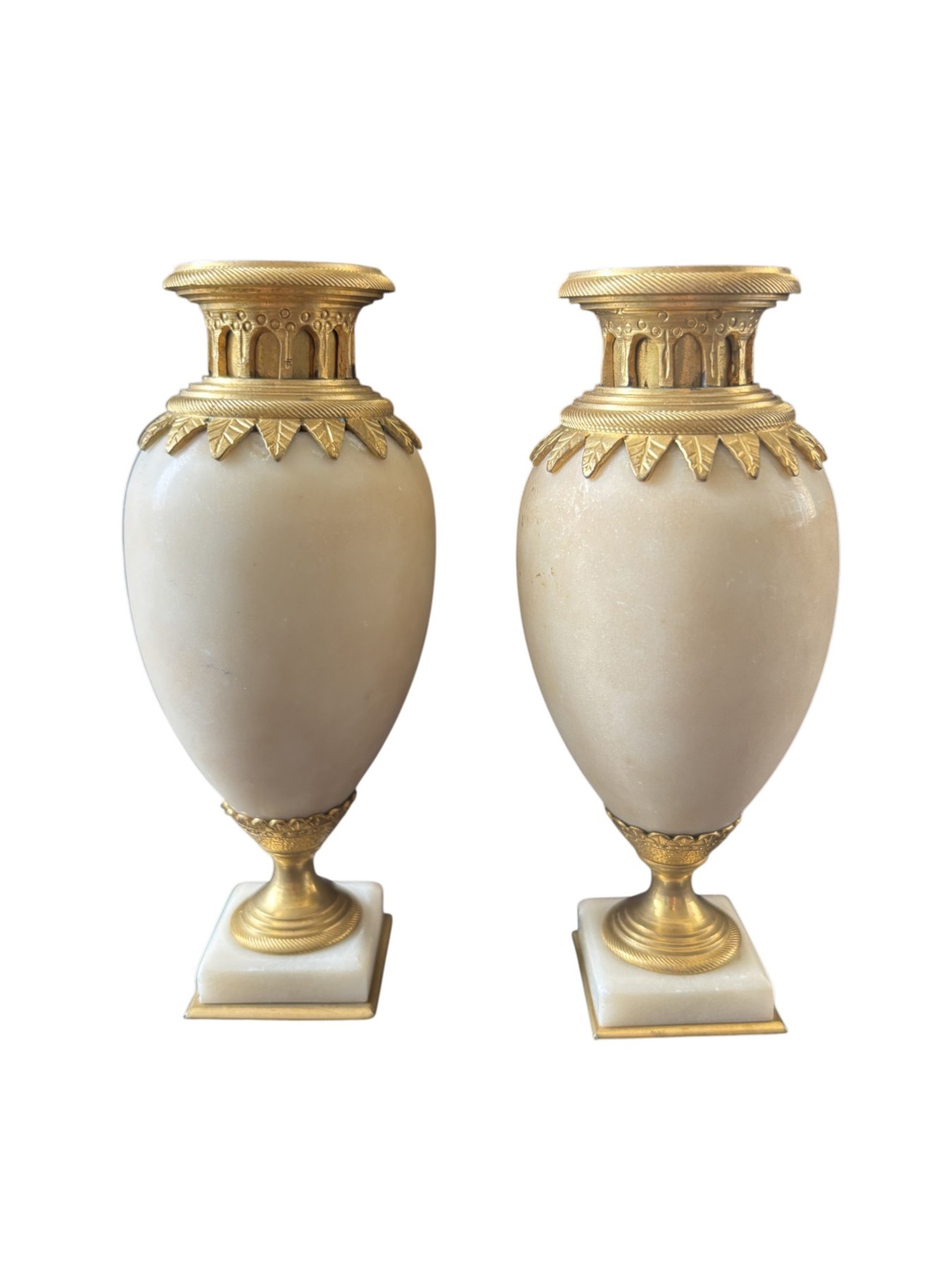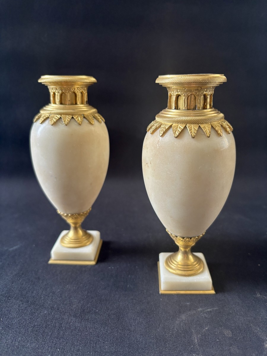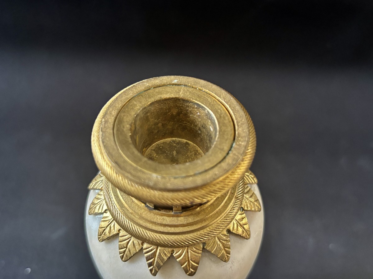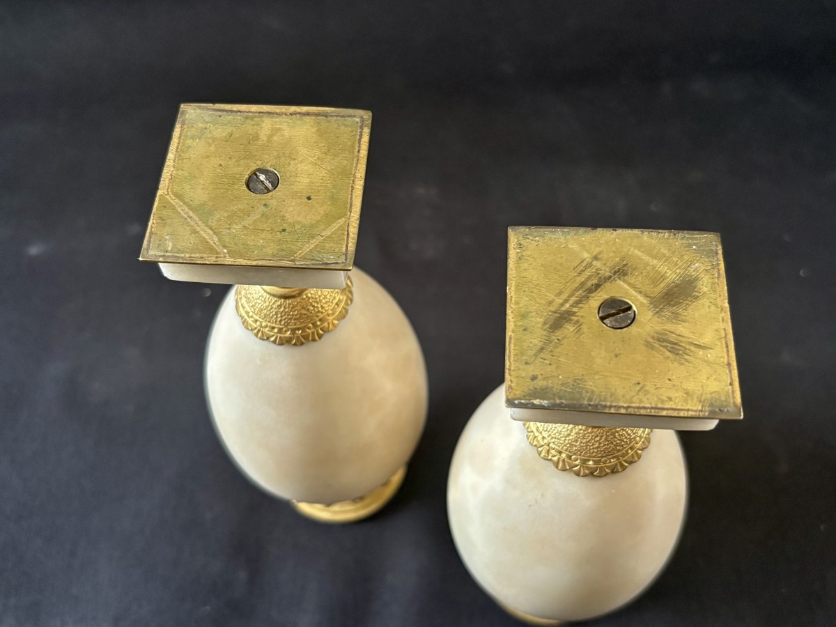 Paire de vases de forme ovoïdes formant bougeoirs en marbre blanc et monture de bronze ciselé et doré, la partie haute du bronze représentant un des étages de la tour de Pise.