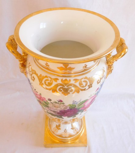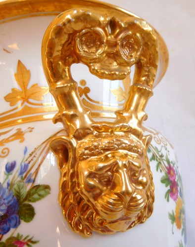 Monumental vase vases d'ornement en porcelaine de Paris. Travail de style Empire, d'époque Restauration - début XIXe siècle, années 1820-1830. De forme balustre à anses latérales en mufle de lion, le vase est orné d'un beau décor dans le goût de Sèvres à bouquets de fleurs polychromes sur fond blanc, palmettes dorées sur le pied. Très belle dorure en mat et brillant sur tout le vase, particulièrement les poignées latérales.