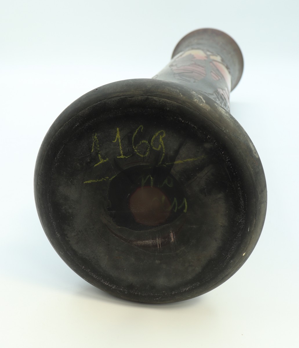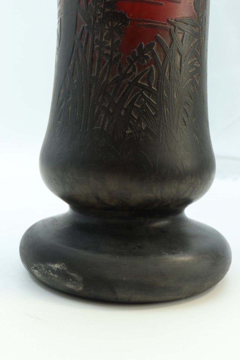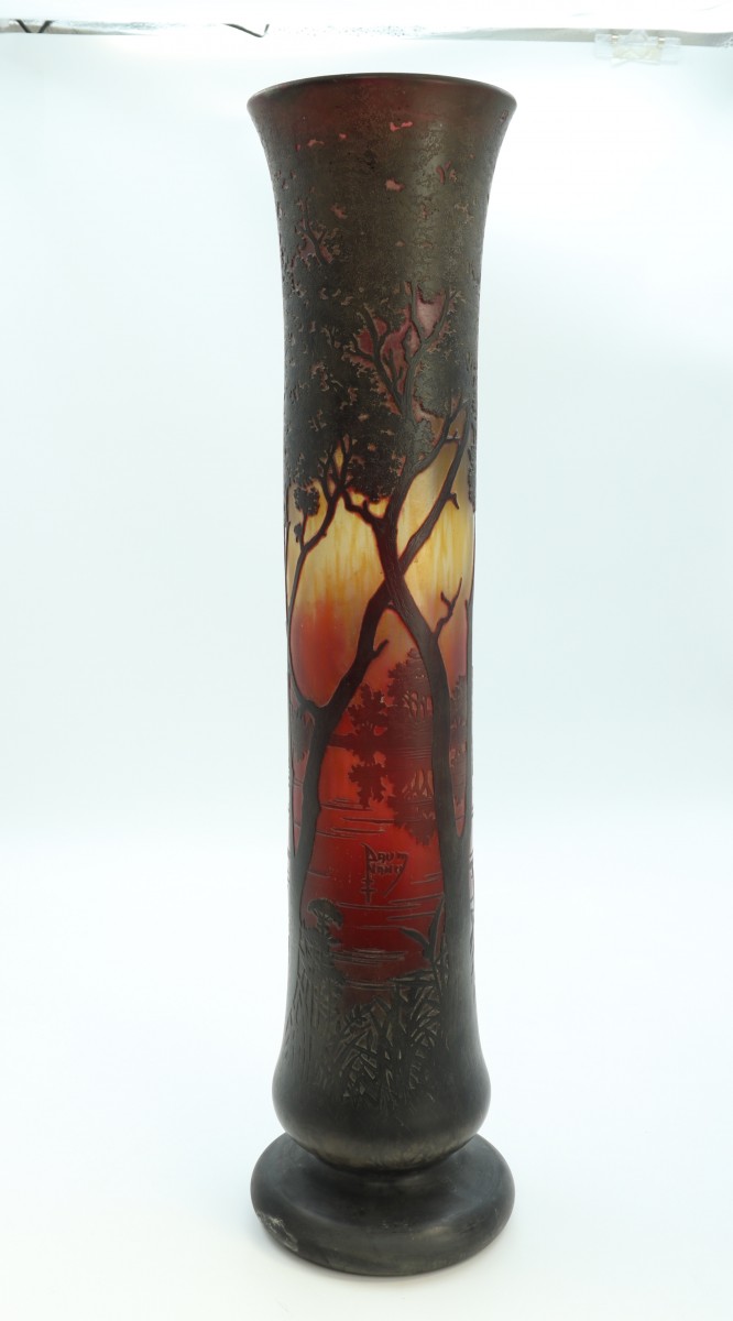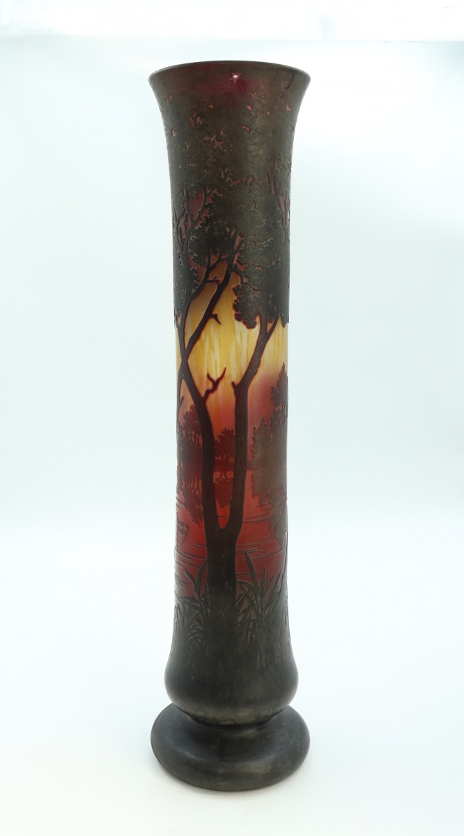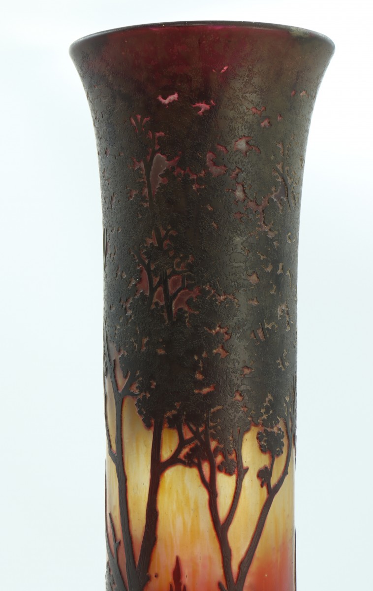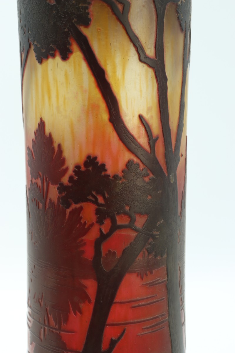 Vase en verre bicouche violet sur fond marmoréen orange à jaune ; décor de paysage lacustre en camée dégagé à l'acide.