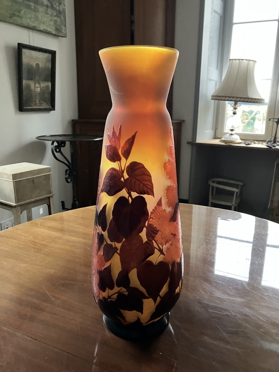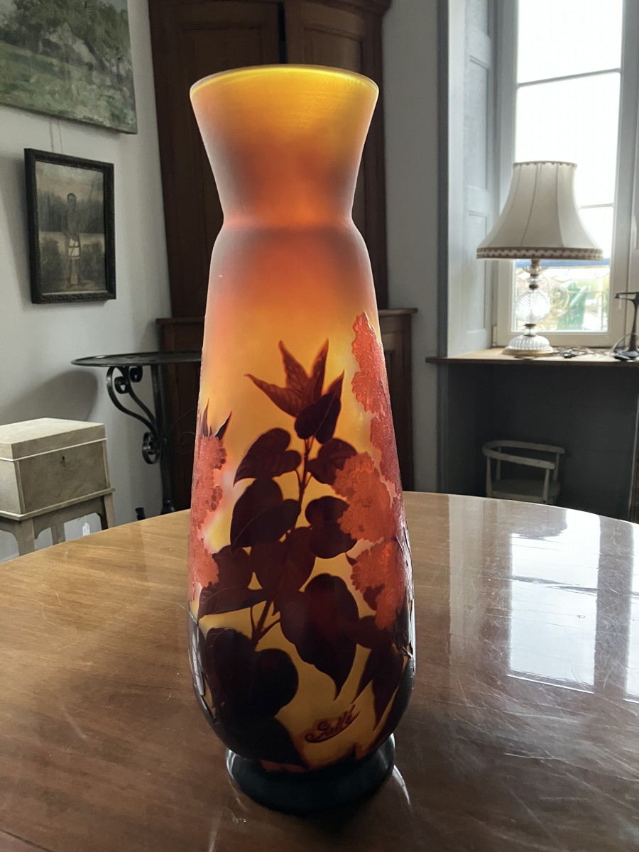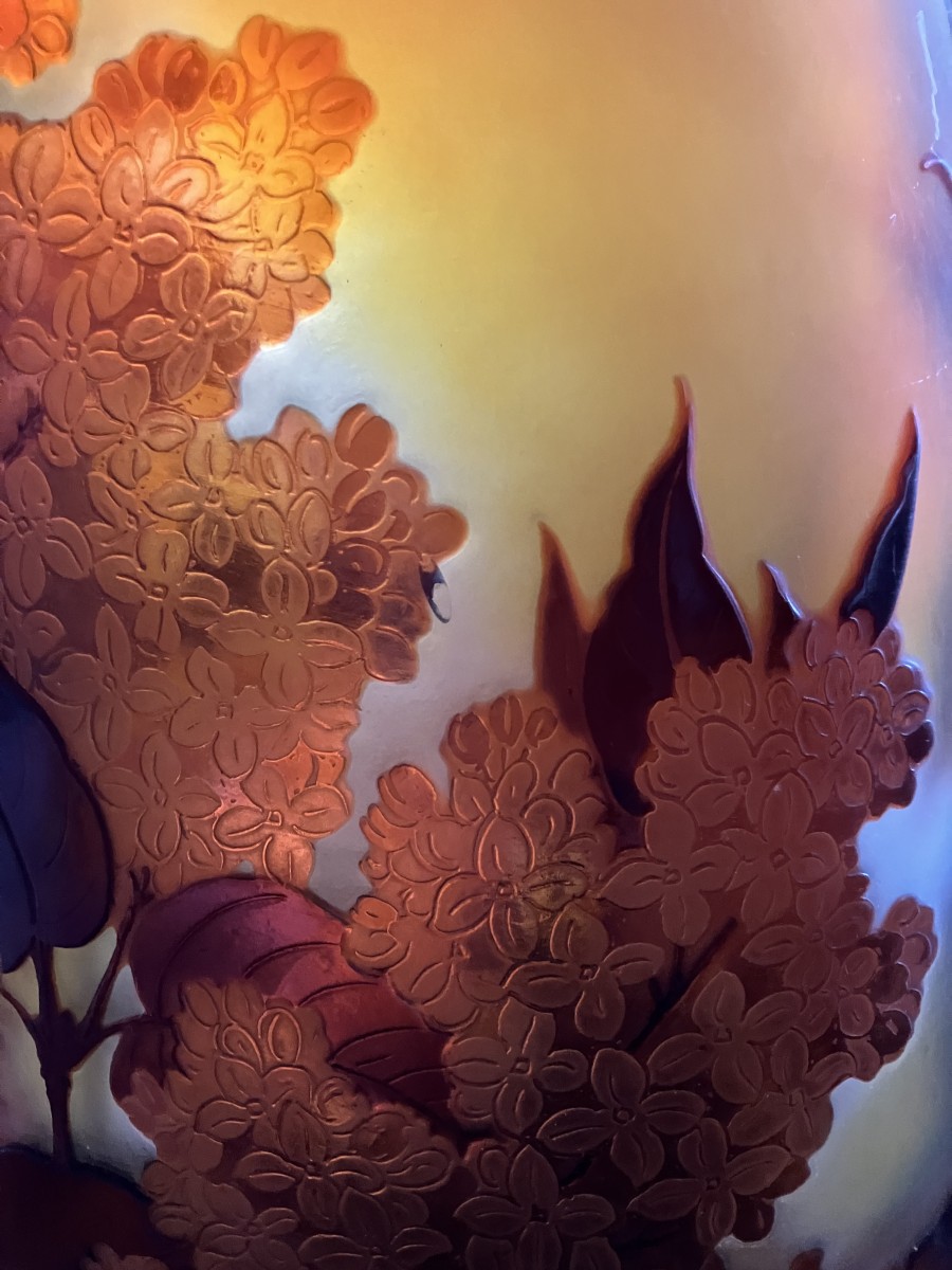 Superbe vase Gallé en verre opalescent multicouche , gravé à l'acide d'un décor de Lilas rouge sur fond jaune.