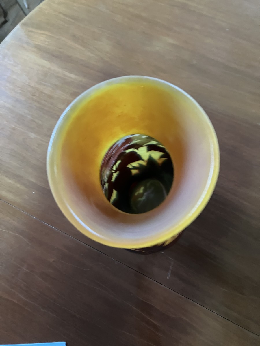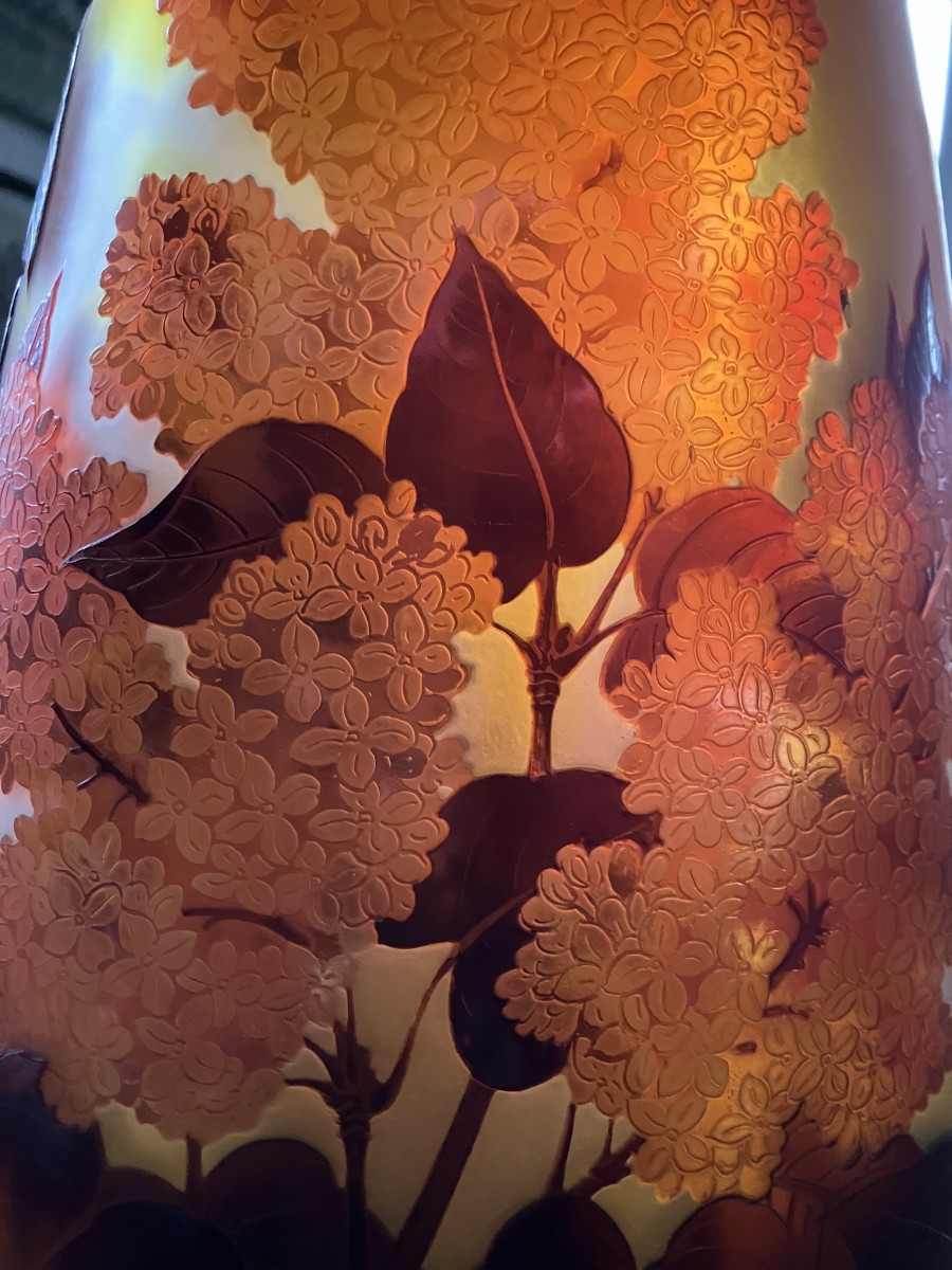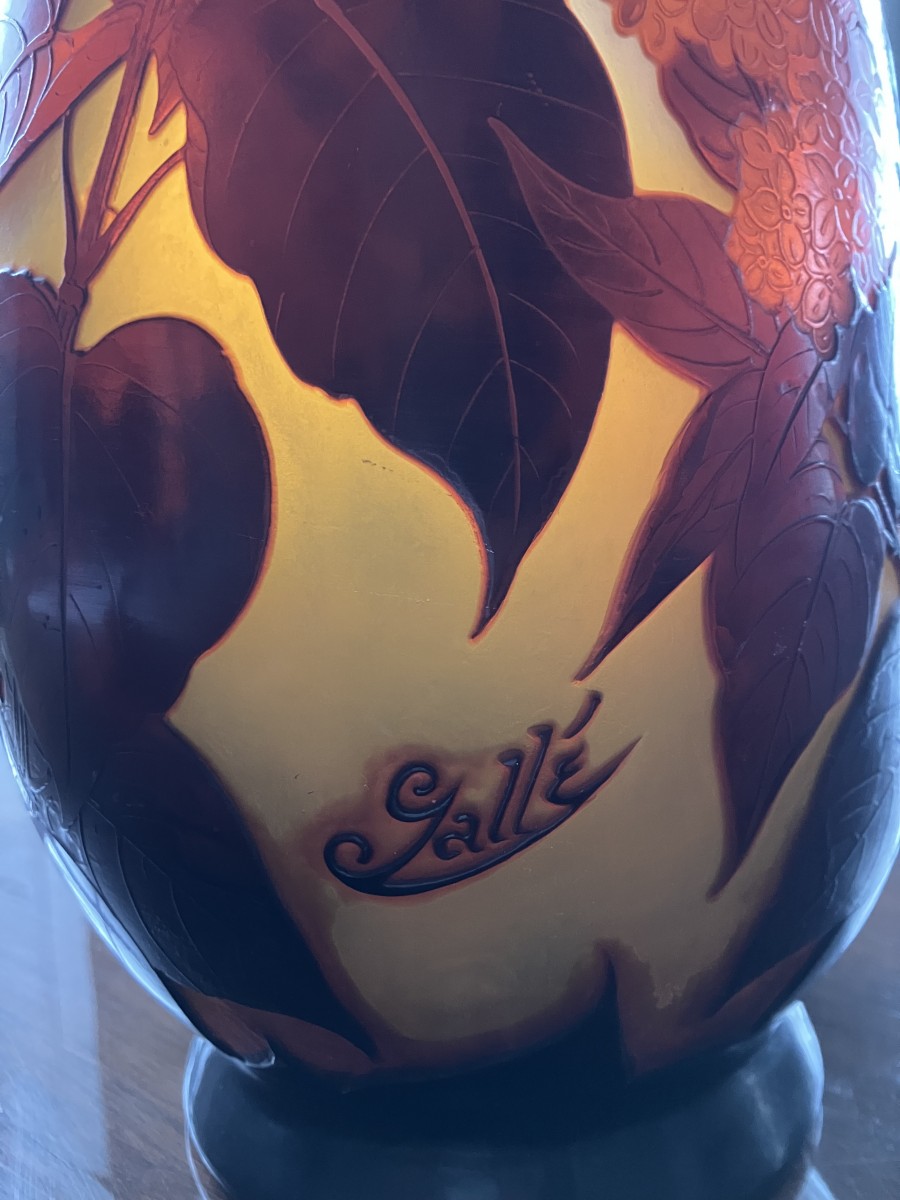 Superbe vase Gallé en verre opalescent multicouche , gravé à l'acide d'un décor de Lilas rouge sur fond jaune.