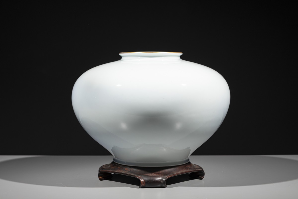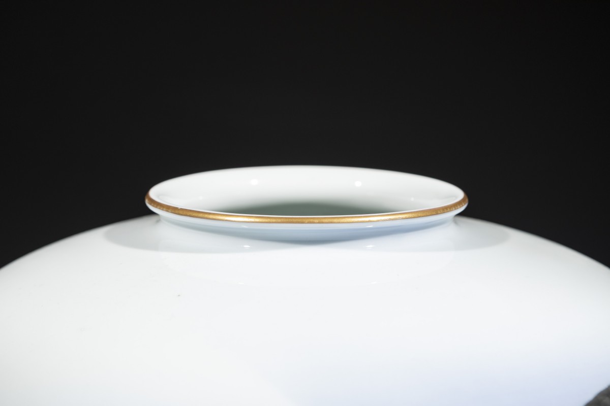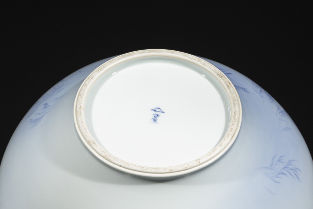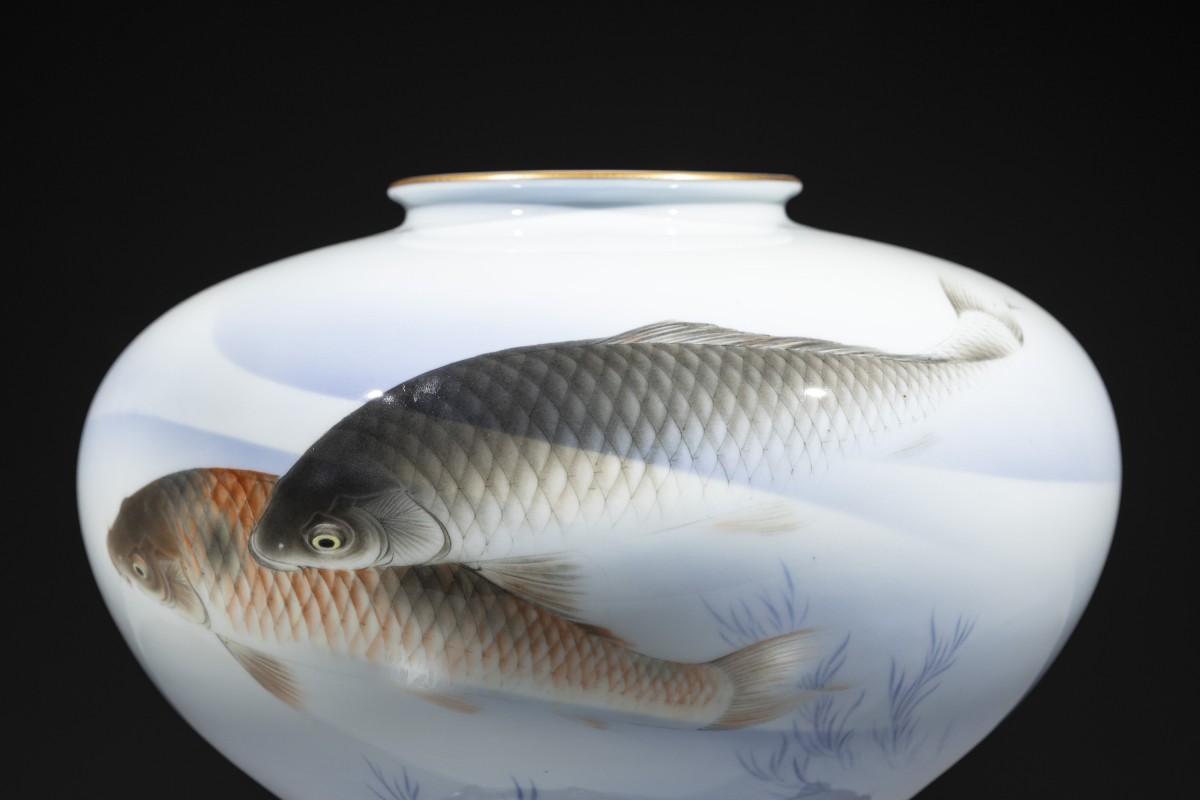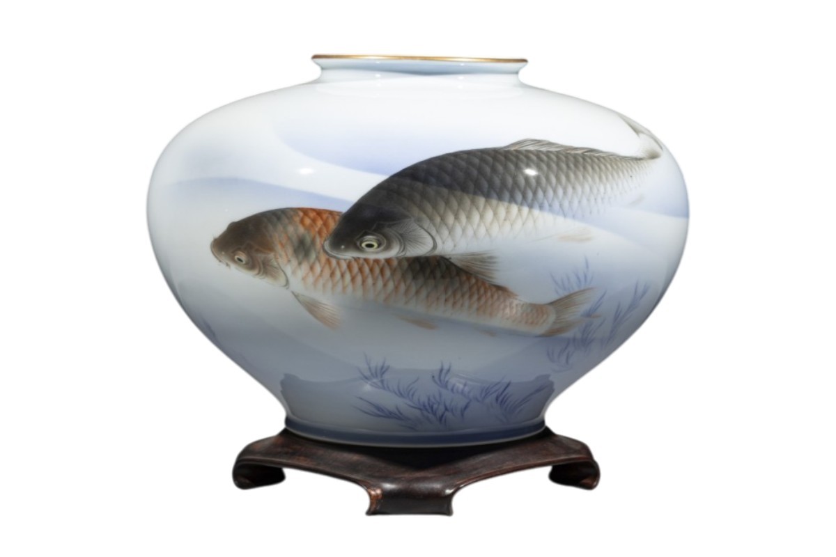 Vase de forme globulaire en porcelaine Fukagawa avec carpes koi, reposant sur une base en bois. La surface, d’un délicat blanc laiteux avec de légères nuances bleutées, est décorée de deux carpes représentées en train de nager. Dans la partie inférieure apparaissent de fines algues stylisées peintes en bleu. Au revers figure un Mont Fuji stylisé au-dessus de la marque de la manufacture Fukagawa.