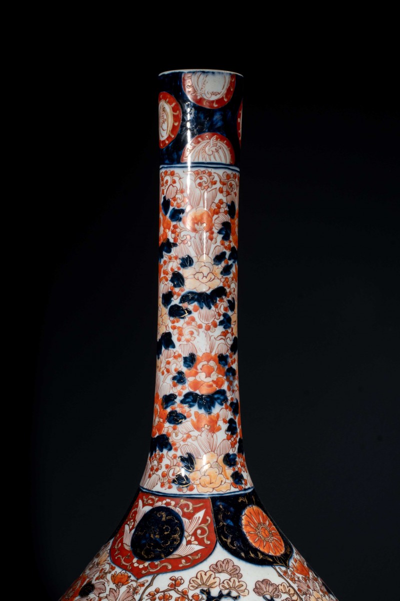 Grand vase Imari japonais de forme globulaire avec un long col, décoré de vases de fleurs encadrés par les figures du dragon et du phénix (ry? et h?-?).