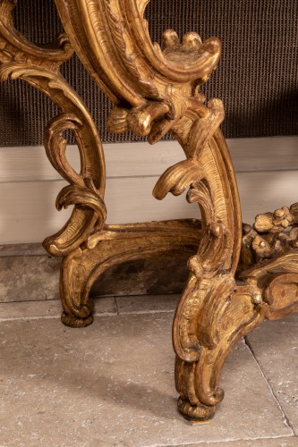 Elle repose sur quatre pieds en double volute ornés en leur sommet d'un cartouche empli d'un feuillage enroulé au-dessus de palmes et feuillages ,se terminant en enroulement d'acanthe. Ils sont réunis par une entretoise centrée d'une large coquille ajourée asymétrique .
