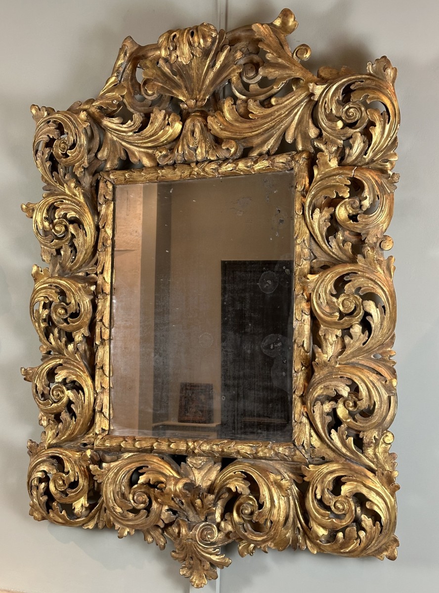 Rarissime grand miroir d’appart Florentin, Toscan de la première partie de la période Baroque en bois sculpté à claires-voies et doré à la feuille puis bruni et amati, de forme quadrilatère rectangle.
