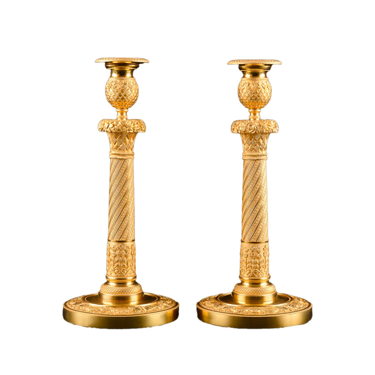 Rare paire de bougeoirs Empire avec paillons richement décorés et exécutés en bronze doré au mercure. Les bougeoirs ont la forme d’un vase balustre avec des motifs d’écailles et de fleurs. Ils reposent sur un chapiteau décoré d’osier et de fleurs, tandis que la tige effilée est ornée d’un motif complexe d’étoiles, qui descend en spirale jusqu’à la partie inférieure, décorée de feuilles de lotus et de fleurs. Sur la base circulaire, nous pouvons distinguer des papillons et des paniers avec des guirlandes de fleurs. Les papillons sont considérés comme un symbole de transformation, de renaissance et de bonheur.