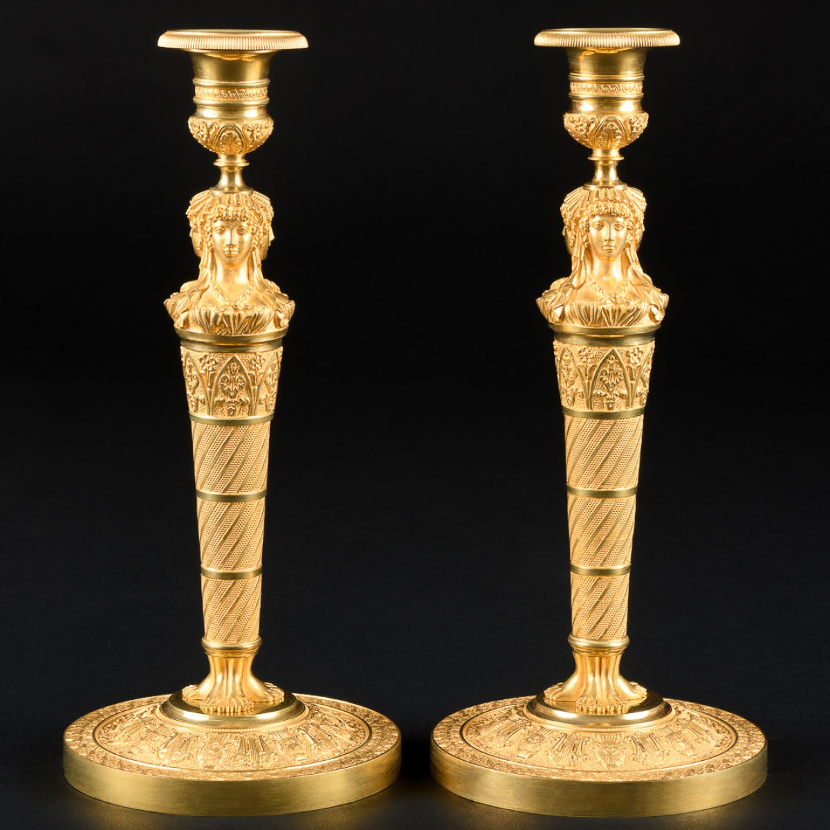 Les bougeoirs, conçus en forme de vase, sont soutenus par trois bustes de femmes égyptiennes portant une coiffe égyptienne traditionnelle. La tige cannelée effilée, ornée de bandes annulaires décoratives séparant des motifs géométriques et floraux, est posée sur trois paires de pieds humains au sommet d’une base circulaire. Cette base présente des décors d’instruments de musique (la lyre) et de vases, bordés d’une frise de fleurs sur fond de maille. L’ensemble de la pièce est exécuté en bronze doré au mercure, présentant un contraste saisissant entre la dorure mate et la dorure brillante.
