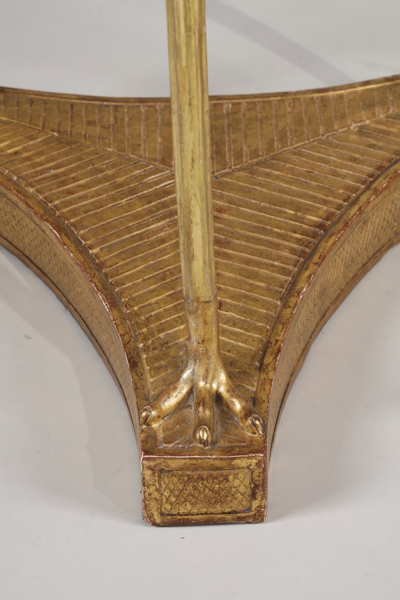 Les pieds, se terminant en griffes d'aigles, reposent sur une base en triangle incurvé à pan coupé ciselé de motifs géométriques.