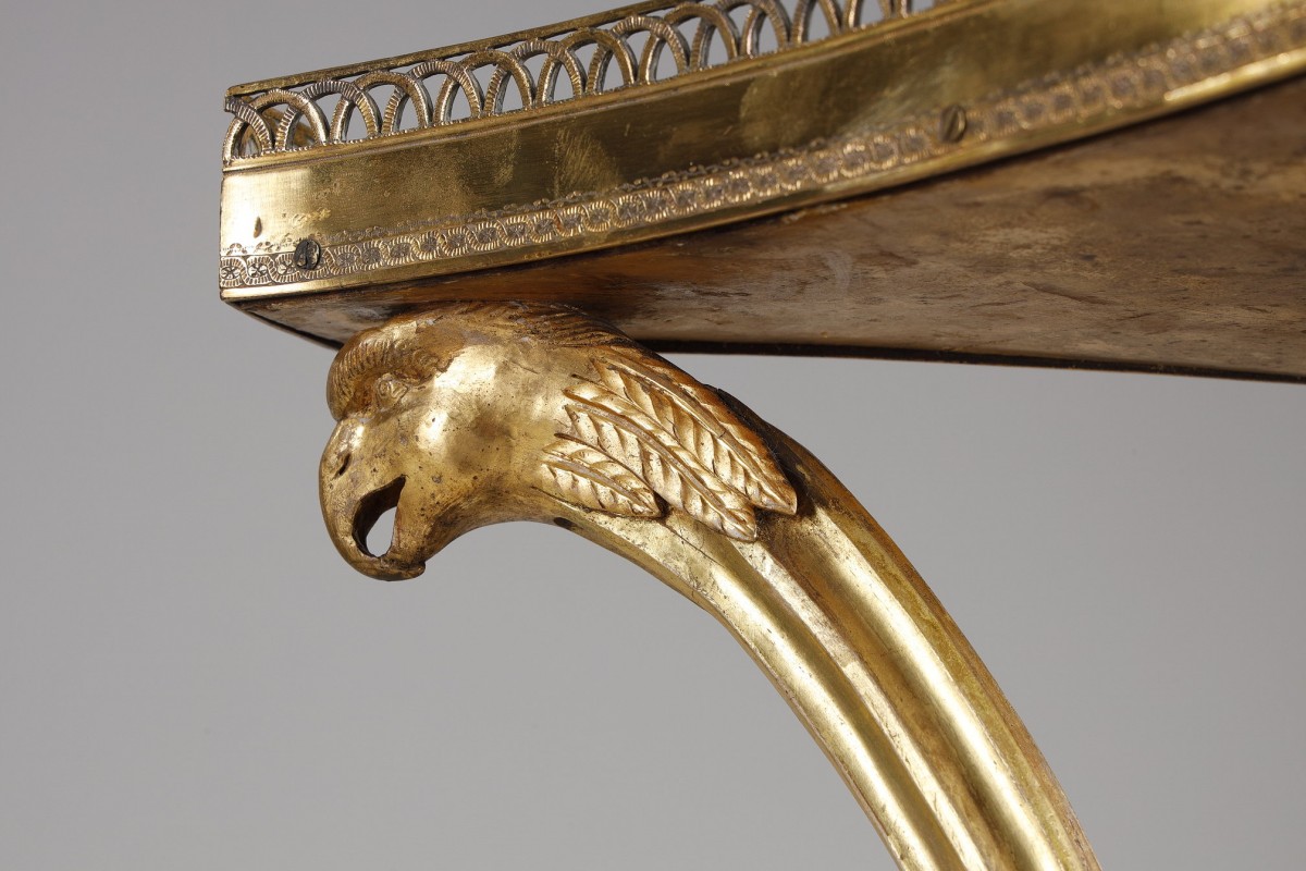 Leur sommet, se terminant par des têtes d'aigles à bec ouvert et finement ciselé, supportent une tablette en triangle incurvé à pan coupé entouré d'une galerie ajourée et finement ciselé et garni d'un marbre blanc de carrare.