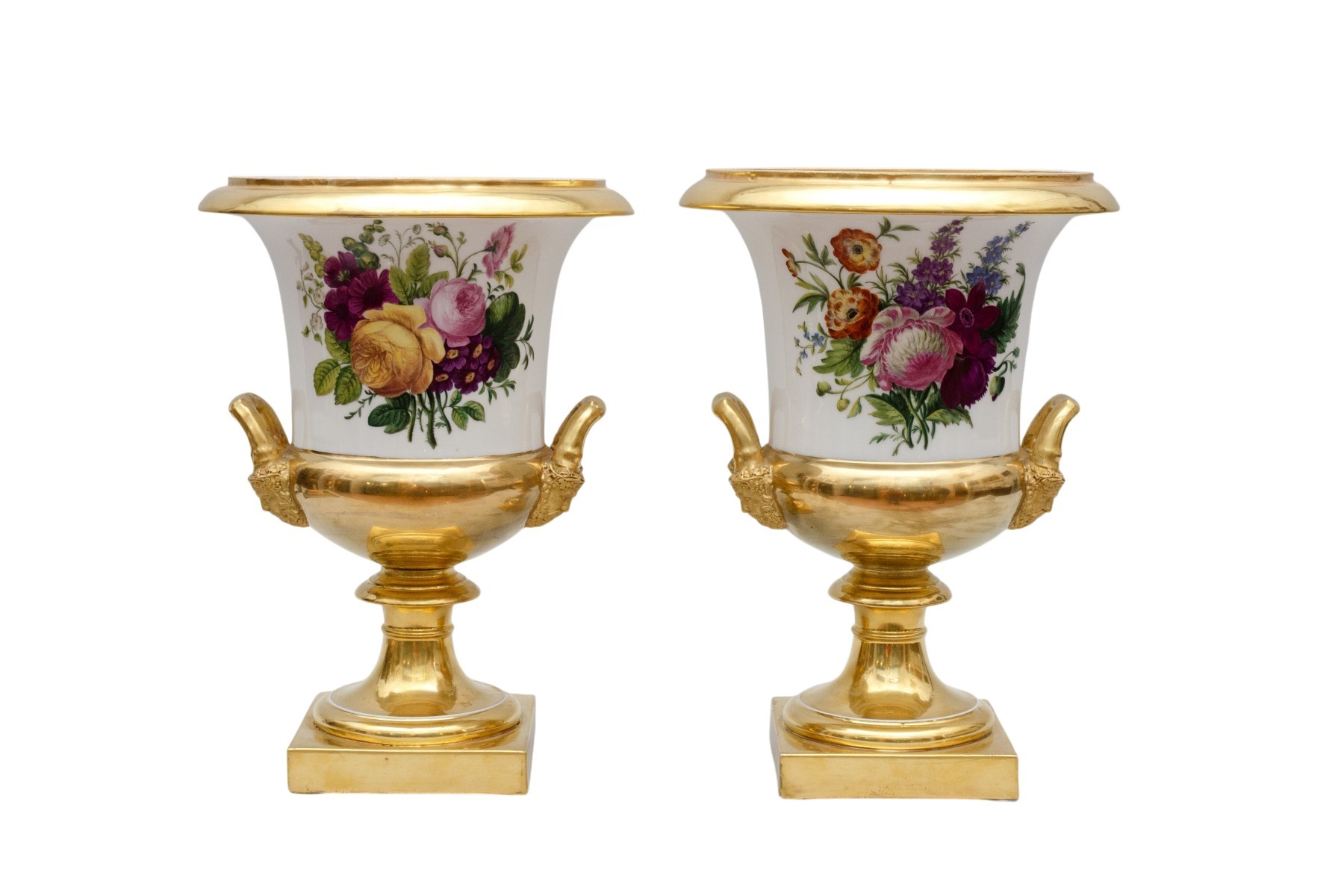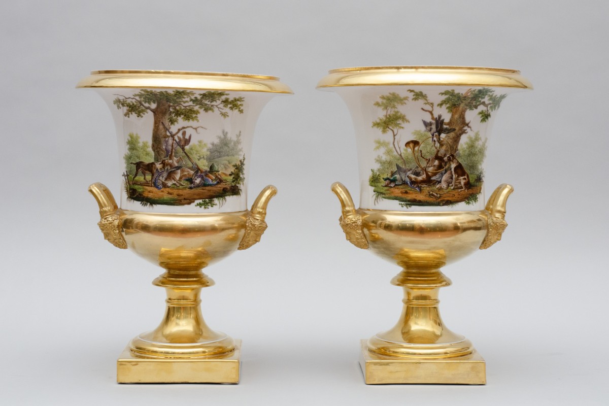 Impressionnante paire de vases Medici ornée de scènes de natures mortes de chasse d'un côté et des bouquets de fleurs colorés de l'autre côté. Anses à têtes d’hommes barbus. Le piédouche et le bord supérieur sont dorés. Très bel état. Signés sous la base "Schoelcher et fils" en rouge.