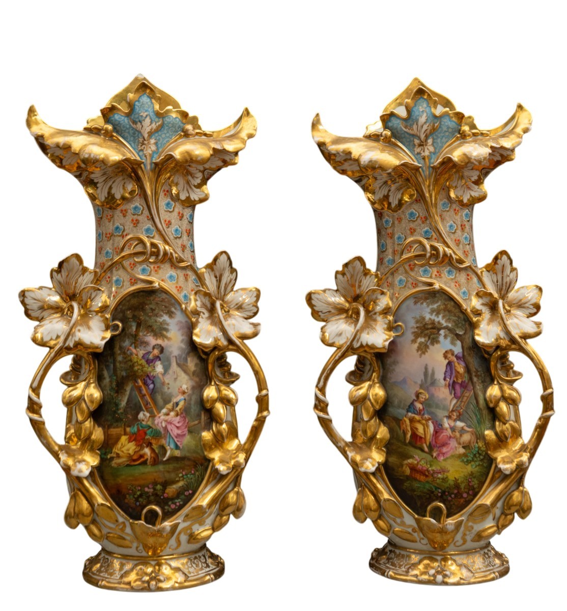 Belle et décorative paire de grands vases balustres en porcelaine de forme Louis Philippe / Napoléon III, à col évasé en corolle feuillagée, anses latérales en feuillages et base ovale mouvementée, richement moulés en relief et rehaussés d'un abondant décor en or au mercure bruni. La face principale de chaque vase est ornée d'une réserve polychrome ovale encadrée de rinceaux rocaille et de feuilles d'acanthe en relief dorées, peinte d'une scène galante idéalisée dans le goût du XVIIIe siècle d'après Boucher et Lancret, l'une représentant un jeune couple et une échelle devant une chaumière, l'autre un groupe assis dans un paysage pastoral. Le col et l'épaulement sont décorés d'un treillis fleuri stylisé, rouges et bleus dans des compartiments dorés sur fond turquoise. Le revers est peint en polychromie d'un généreux bouquet de fleurs de ...