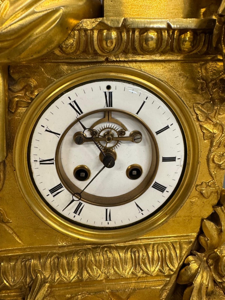Grande pendule en bronze doré représentant "Calliope" , Muse de la poésie épique.