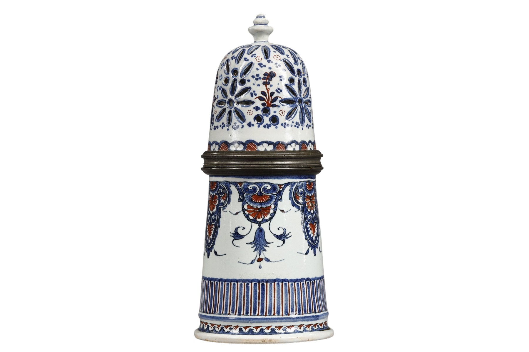 Belle et grande saupoudreuse en faience de Rouen de forme tronconique, le pas de vis reliant le corps au couvercle en étain.