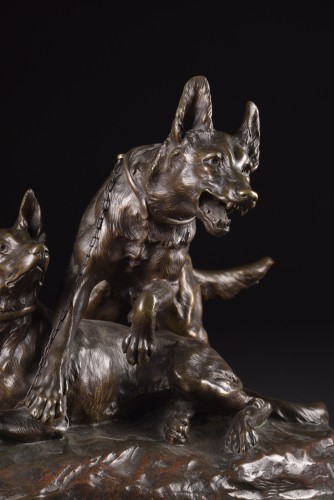 Cette belle statue en bronze de deux bergers a été créée en 1923 pour le Salon des Beaux-Arts par R. Varnier. R. Varnier a une capacité phénoménale à modeler les bonnes proportions, les muscles et surtout leur émotion. Les chiens sont enchaînés à un poteau avec leur nourriture à la base. L'un est allongé avec un visage alerte et les oreilles vers le haut et vers l'avant, tandis que l'autre moitié saute par-dessus son partenaire avec une jambe vers le haut, la bouche ouverte et les oreilles vers l'avant. Le bronze est patiné et en très bon état. La signature de Varnier est gravée au dos du bronze comme R Varnier, et le Salon des Beaux-Arts 1923 est gravé sur le côté droit de la base et Patrouilleau éditeurs, France 1923.