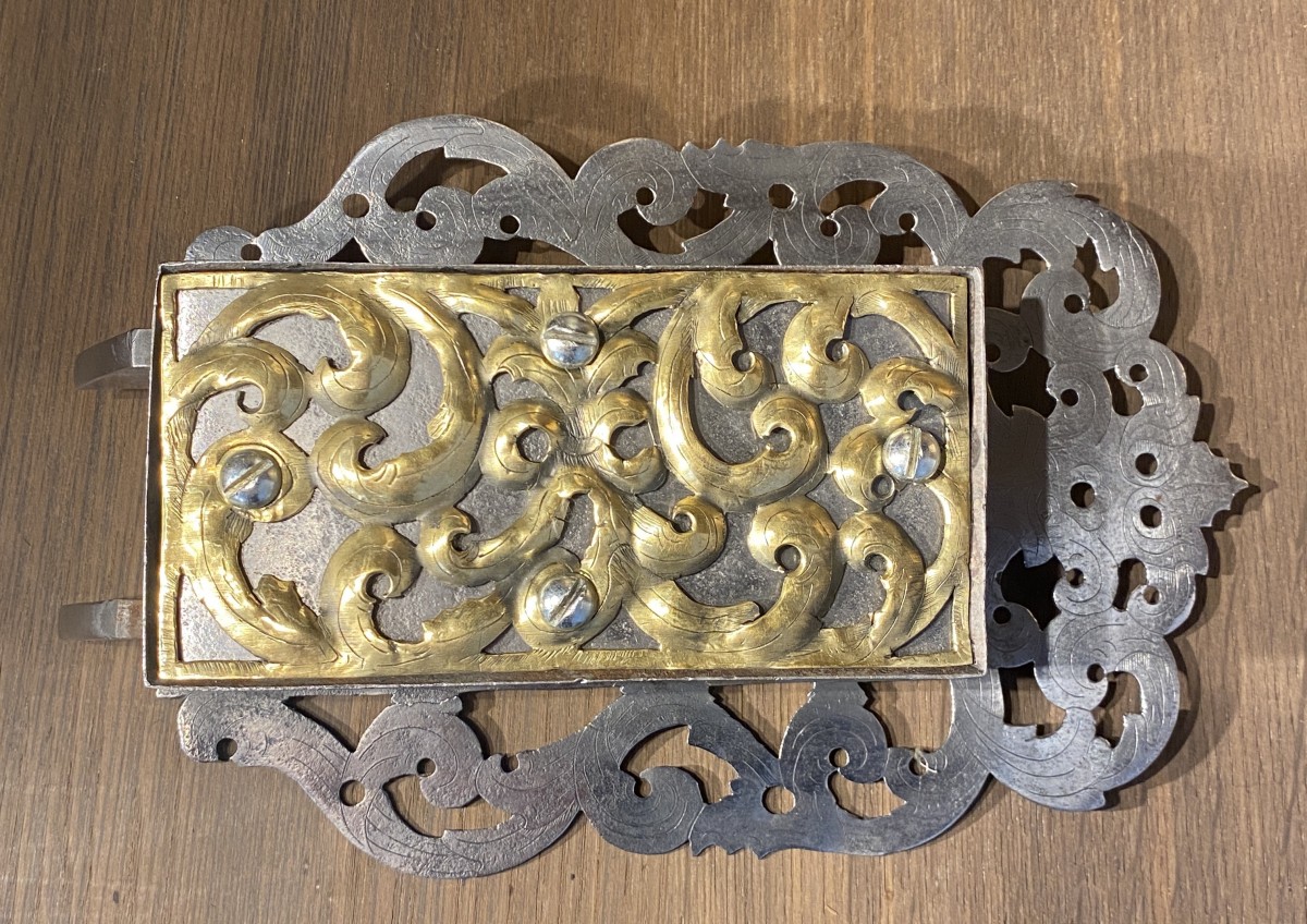 Grande serrure allemande en fer avec une élégante décoration en laiton, début du 18e siècle. Boîte rectangulaire avec recouvrement en laiton ajouré en forme de vrilles gravées et de feuillages en relief. Trois pênes. Vissé sur une plaque de serrure incurvée avec un décor gravé parmi lequel une charmante tête de monster (homme vert). Usure, bon état. Avec clé.