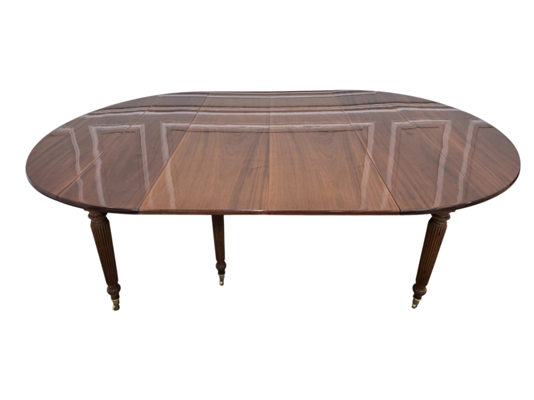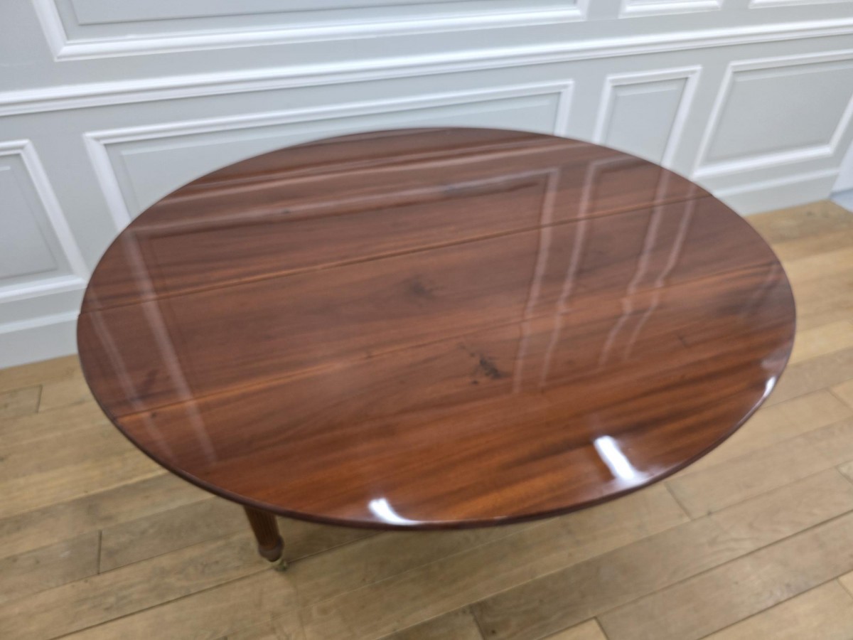 Grande table en acajou reposant sur six pieds avec roulettes fin 18e début 19e.