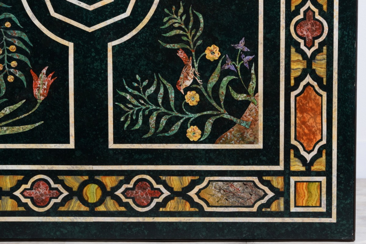 Cette table a été fabriquée dans les années 1950. La structure est en fer forgé avec les quatre jambes raccordées en haut et en bas par des traverses et des articulations carrées qui reprennent le dessin des pieds. Le plateau, de forme rectangulaire, est en bois laqué en faux marbre. La décoration simule un plan en commis des plus précieux marbres et pierres dures à échantillonnage, c’est-à-dire différents de coloration, dans un style caractéristique de la zone toscane. Un cadre parcourt le profil du plan avec des dessins géométriques spéculaires. Au centre, à l’intérieur de quatre carrés, sont représentées des natures mortes avec des plantes à fleurs et des oiseaux polychromes sur un fond sombre.
