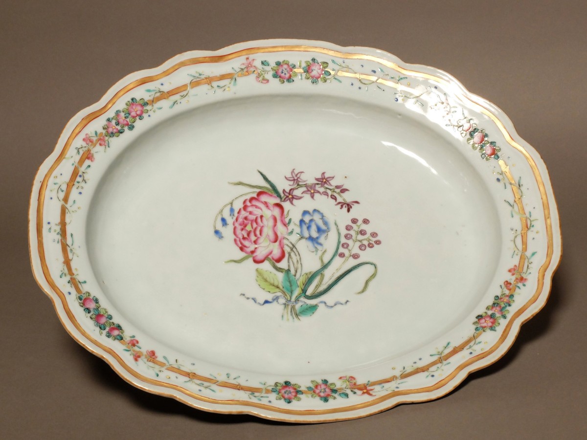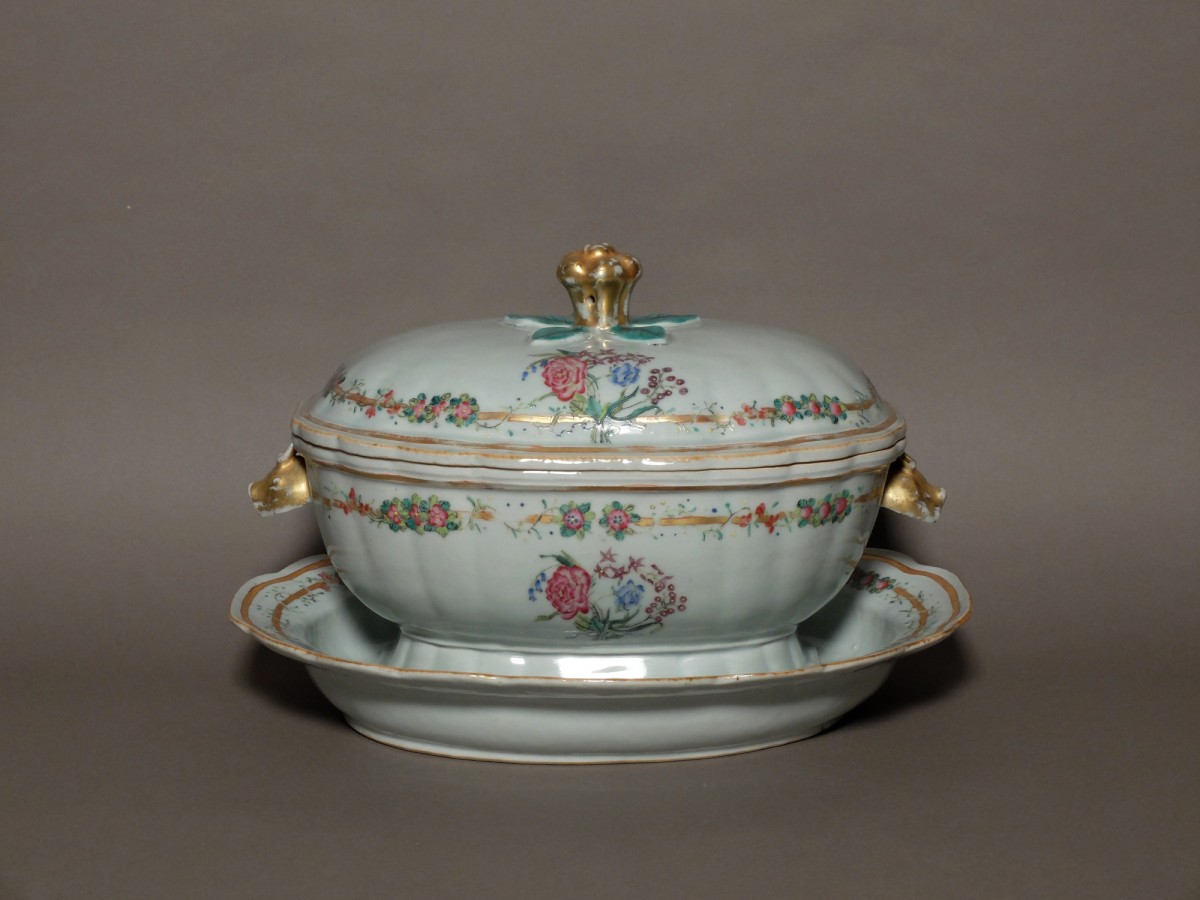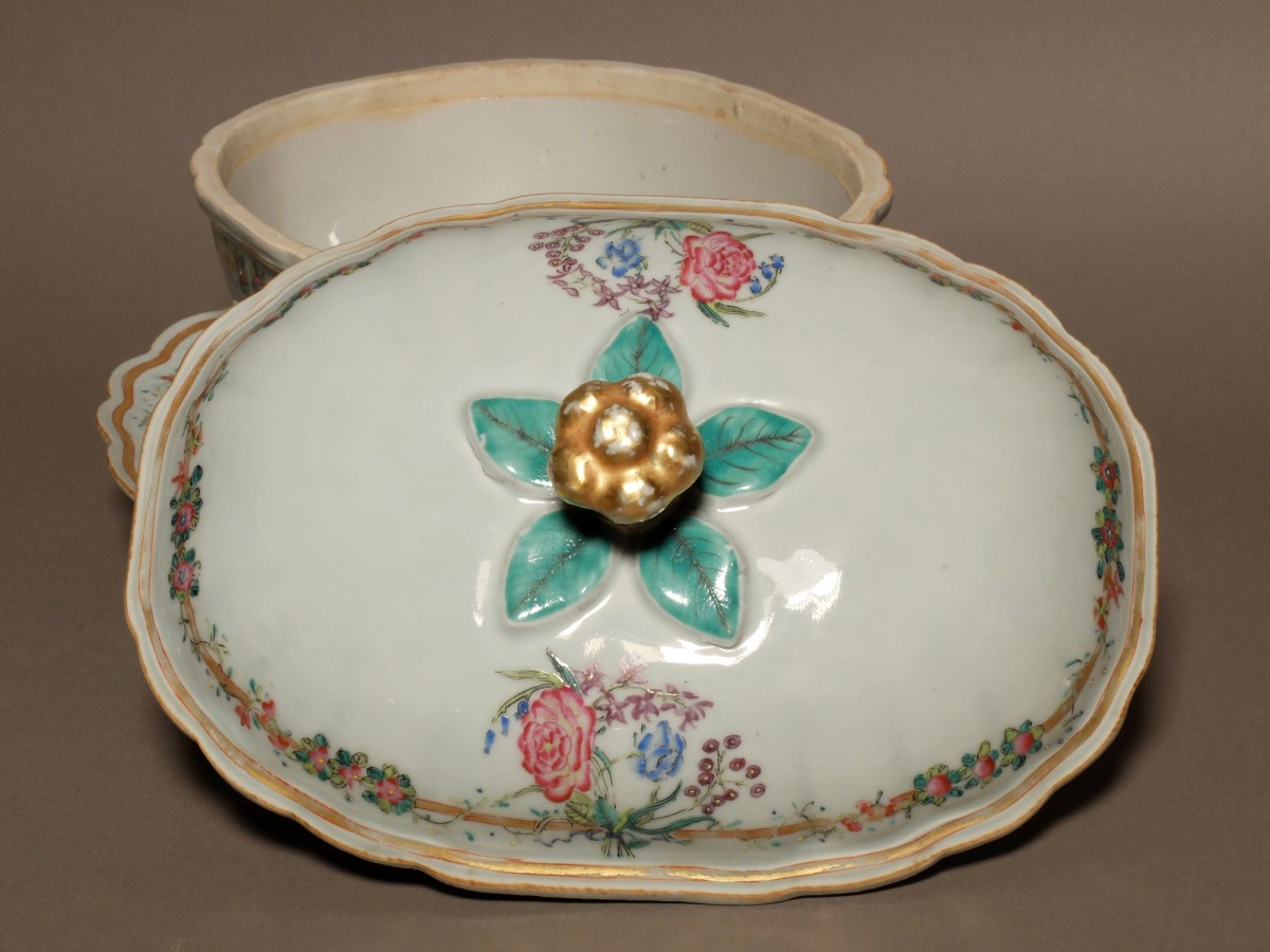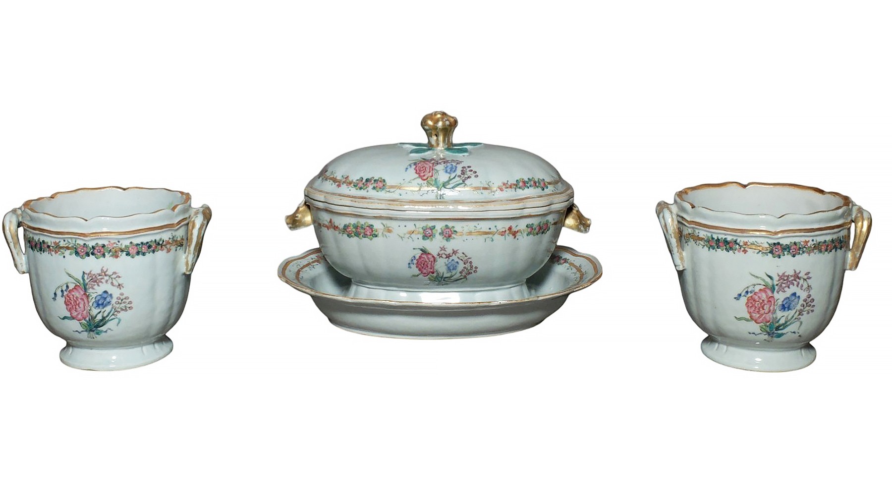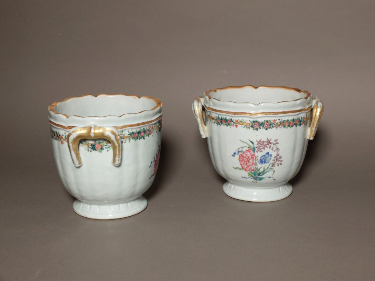 Fortement inspiré des modèles d'orfèvrerie, ces pièces sont décorées d'émaux de la famille rose. Ornées de bouquets de fleurs, elles sont agrémentées de guirlandes de fleurs au pourtour des pièces.
