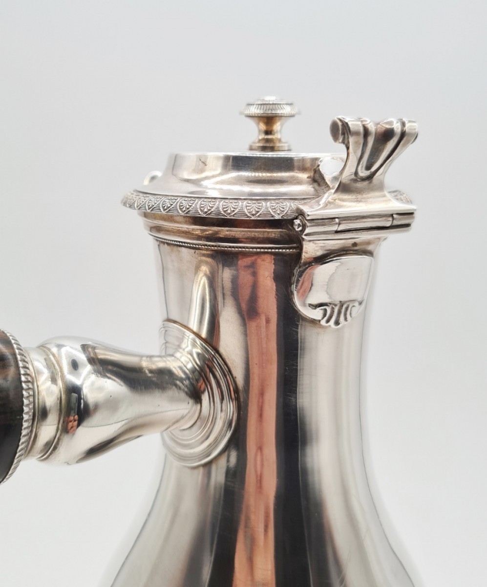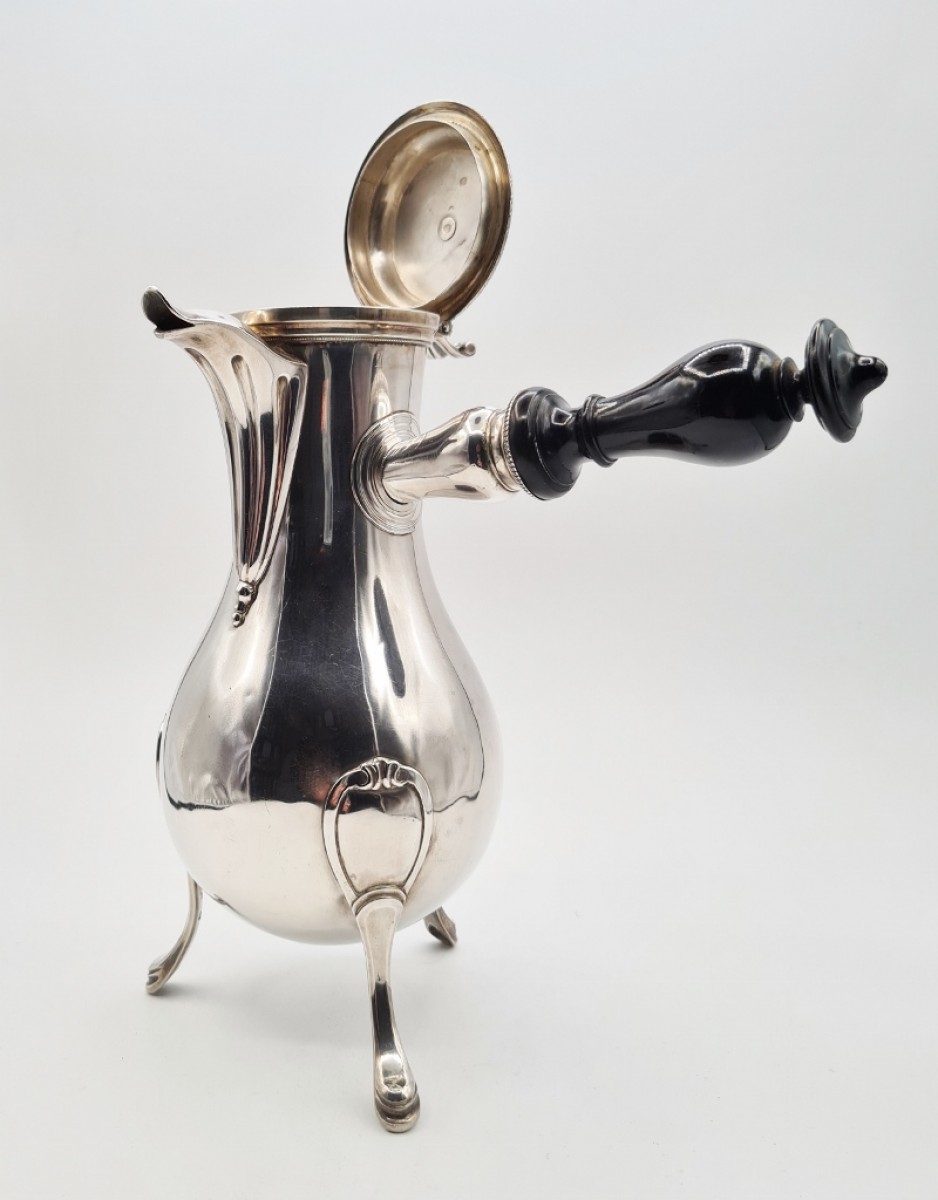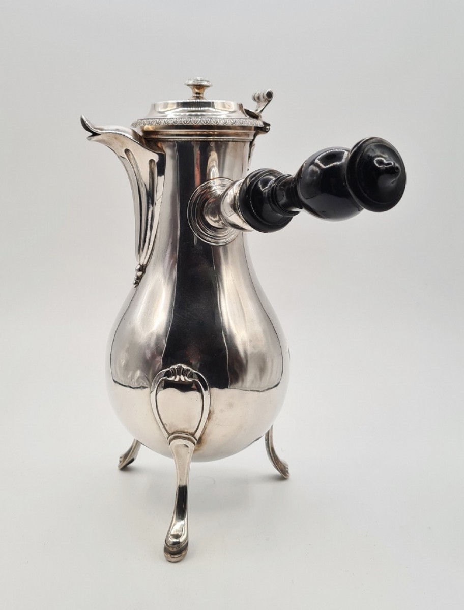 Grande et importante verseuse tripode en argent massif à prise latérale. Le couvercle est bordé d' une frise de palmettes et son bouton d' une rangée de petits godrons, le bec verseur est orné de cannelures. Le manche est en ébène.