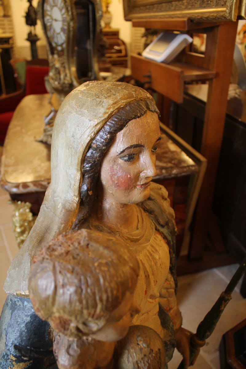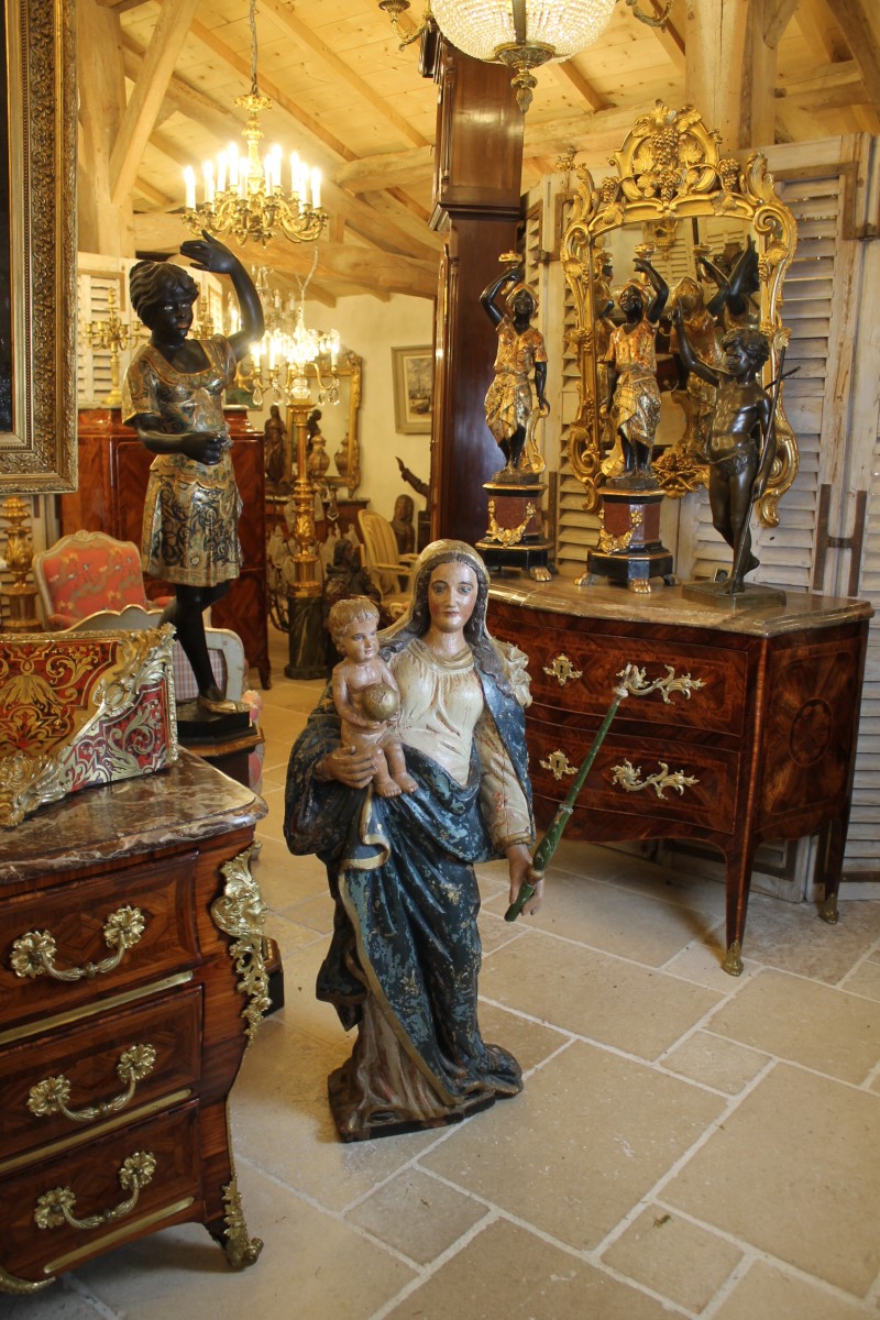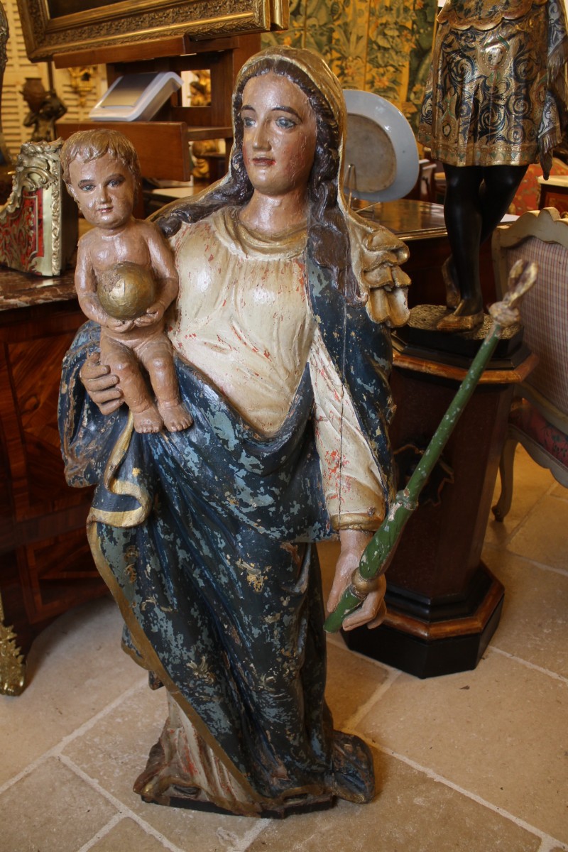 Importante sculpture de la Vierge à l'enfant en bois de chêne polychrome, elle tient l'enfant Jésus nu une sphère dans les mains sur son bras droit et un sceptre de la main gauche.