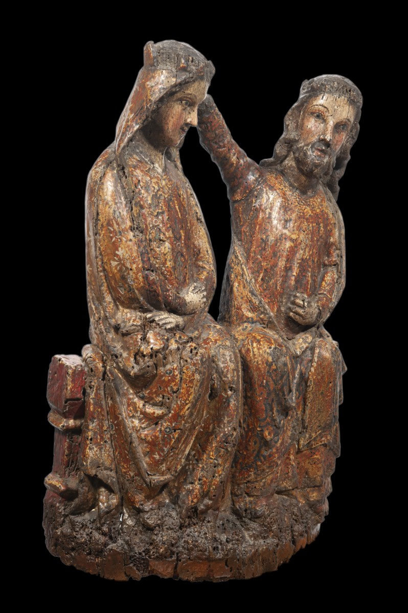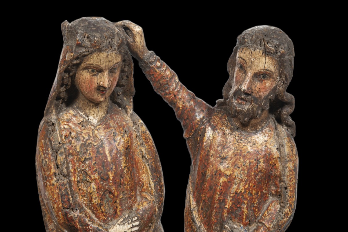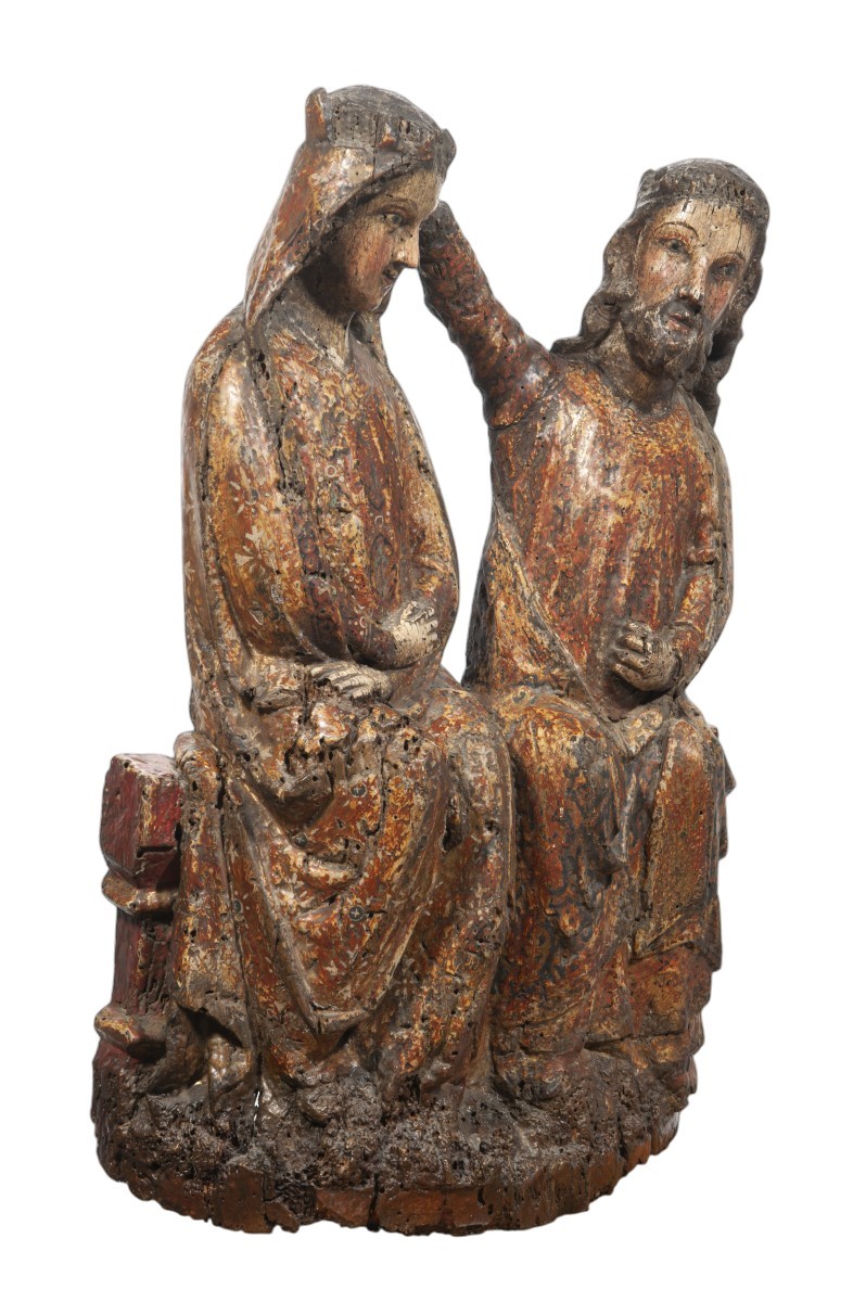 Rare groupe sculpté en bois fruitier ou en hêtre, représentant le Couronnement de la Vierge. Le Christ et la Vierge sont assis sur un même tronc d'arbre au moment où le Christ lève la main droite pour déposer la couronne sur la tête légèrement inclinée de la Vierge.