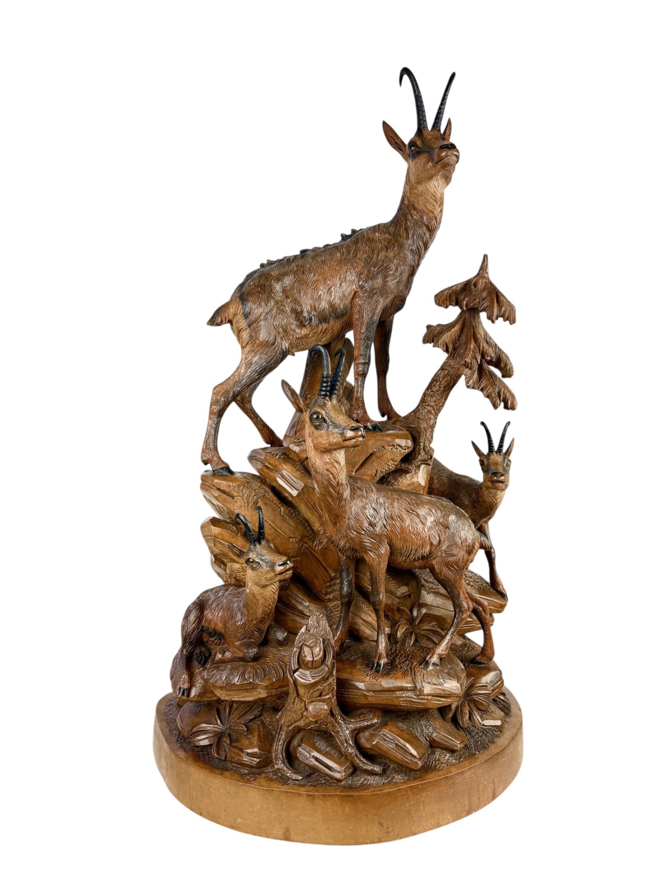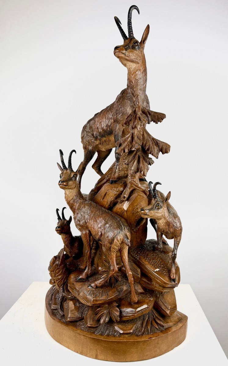 Impressionnante sculpture en noyer de la Forêt-Noire de la fin du XIXe siècle représentant ungroupe alpin dynamique de chamois sur un promontoire rocheux, accompagné d’unarbre stylisé. Travail finement détaillé, avec un excellent modelé du pelage,des têtes expressives et une composition étagée harmonieusement équilibrée.Belle patine d’origine riche. Exemple substantiel et décoratif de la sculptureanimalière traditionnelle de la Forêt-Noire. Dimensions: