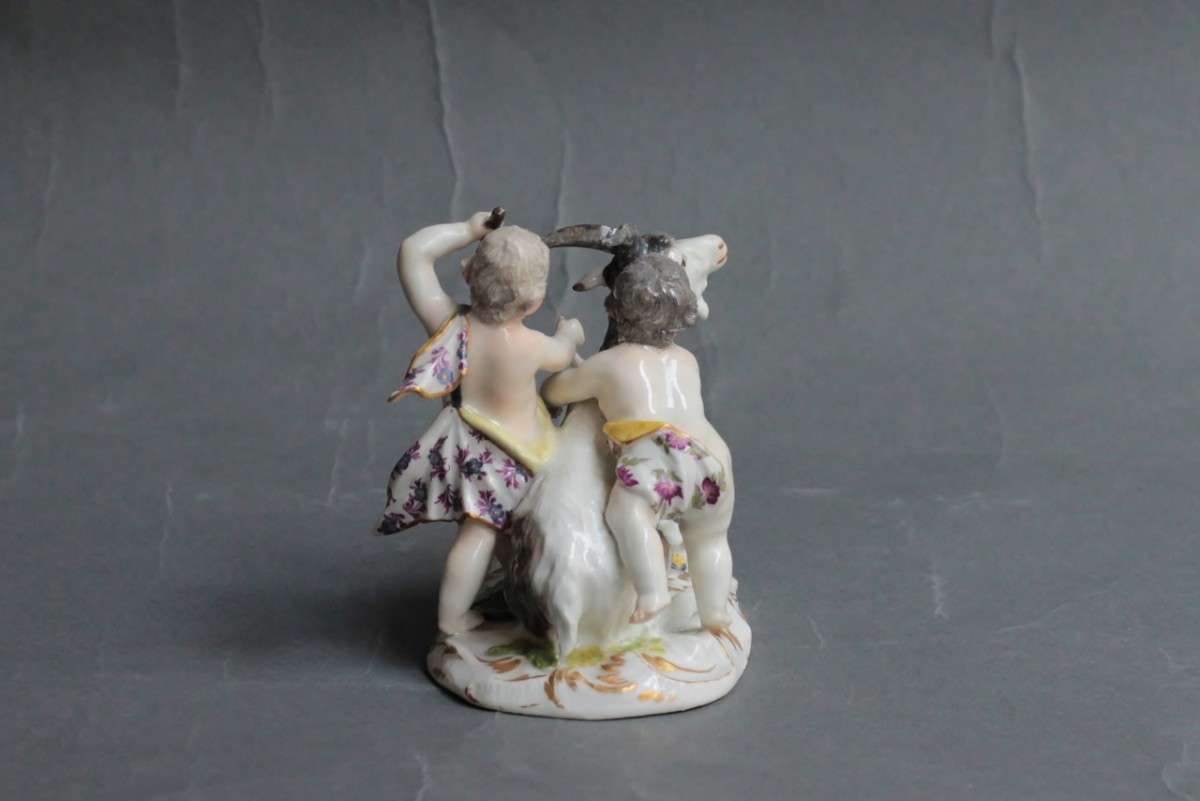 Groupe en porcelaine de Meissen formé de deux amours drapés jouant avec un bouc sur une terrasse à ornements rocaille en relief rehaussés d'or, les draps décorés de fleurs des Indes et doublés de jaune.