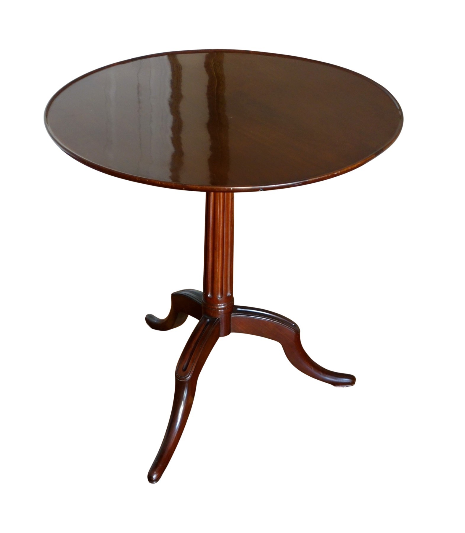 Guéridon de bibliothèque ou table de salon format table à thé, plateau en cabaret basculant, en acajou massif . Le fût cannelé repose sur un piètement tripode à pieds patin. Epoque Louis XVI, fin XVIIIe siècle. Estampille de Canabas que l'on distingue sous le vernis.