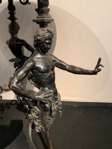 Le piètement est constitué de trois satyres en bronze patiné brun. Ces demi-dieux de l’Antiquité sont représentés mi-homme, mi-bouc. Souvent associés au dieu du vin Dionysos, dansant joyeusement, une main sur la hanche, l’autre tendue vers l’avant.
