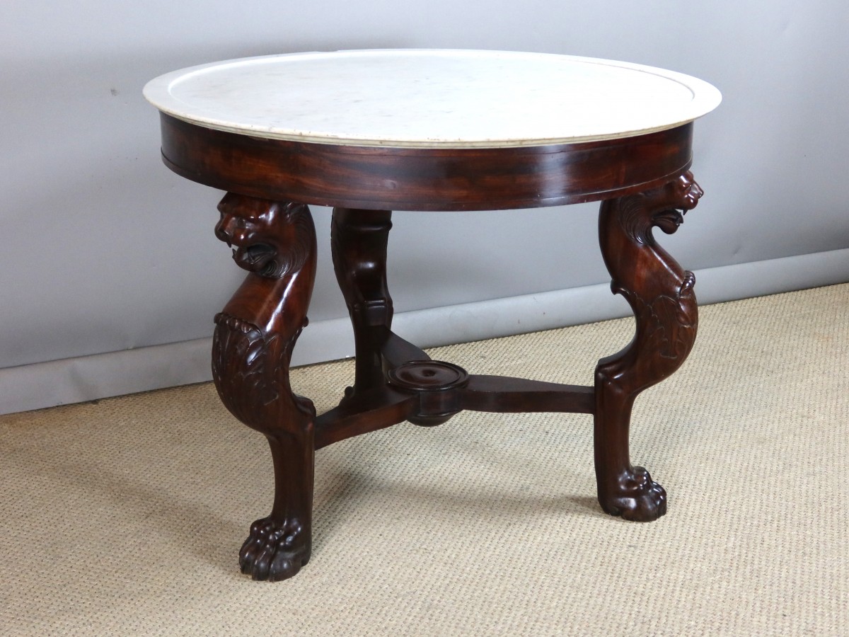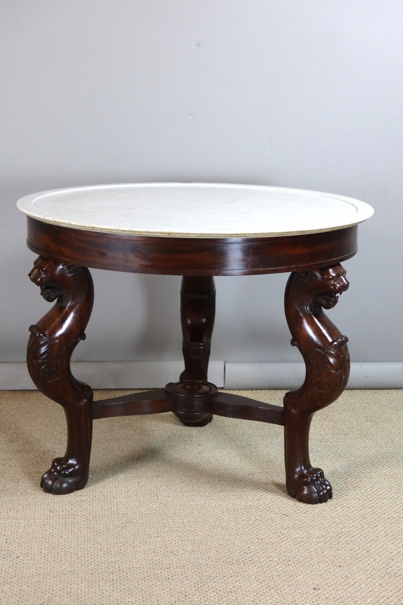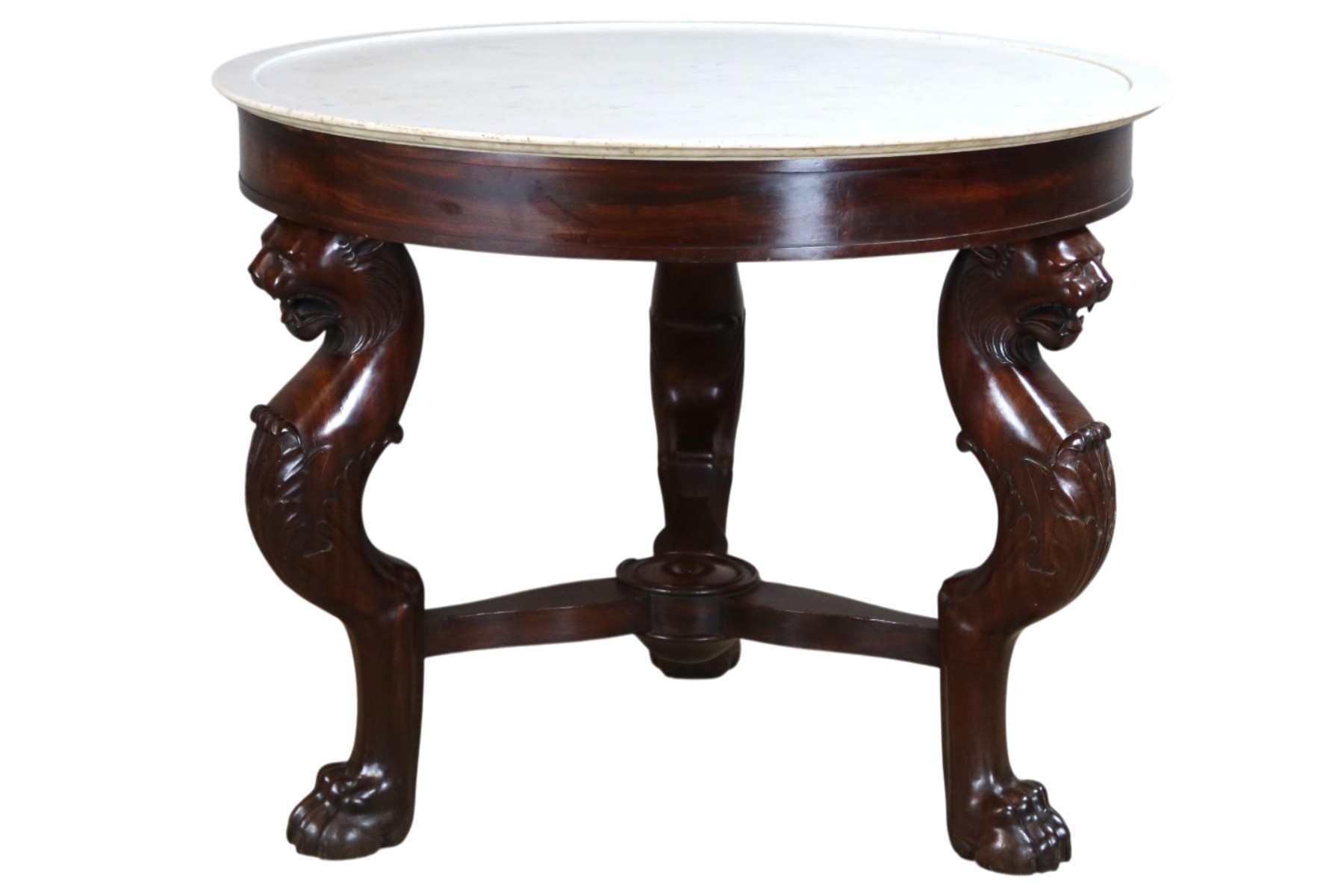 Retrouver le mobilier ou les objets d''art similaires à « Guéridon époque Empire en acajou aux têtes de lions » présenté par Philippe Cote Antiquités, antiquaire à Chauffailles dans la catégorie Table & Guéridon Empire, Mobilier.