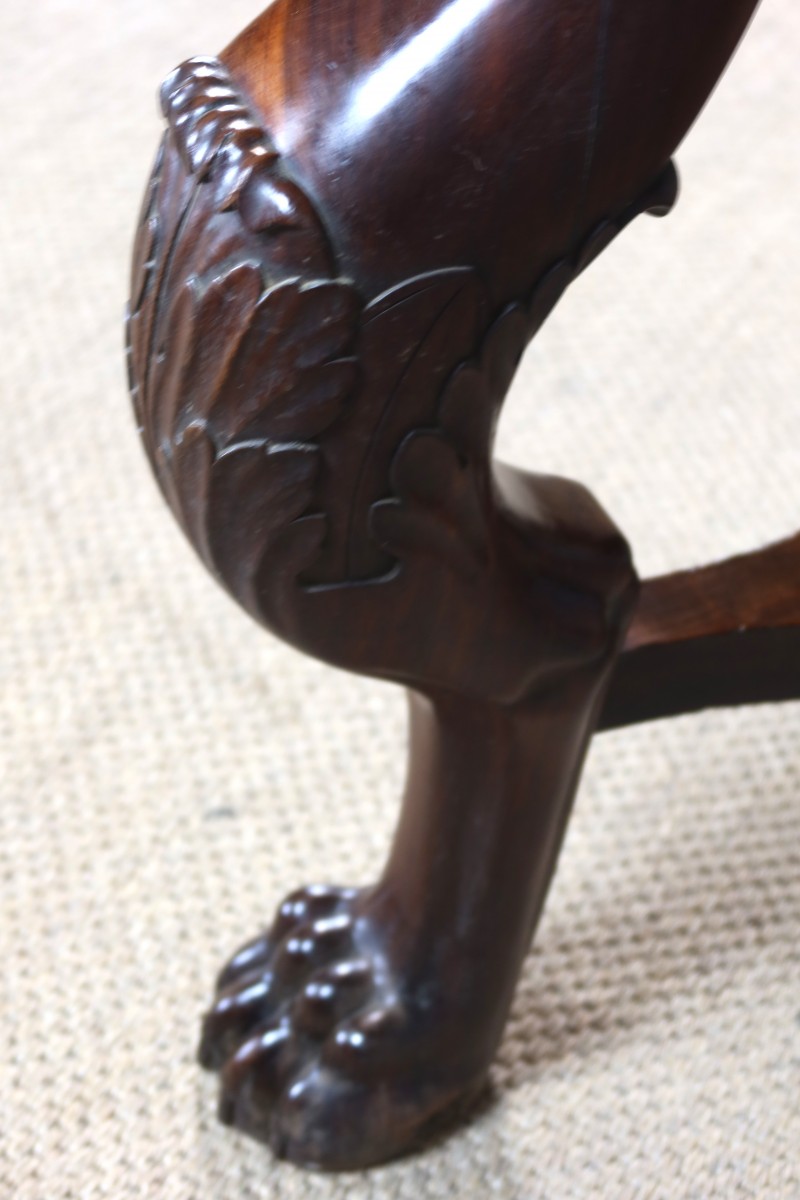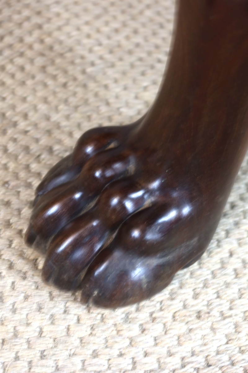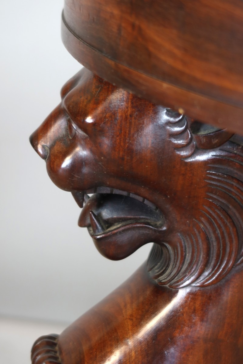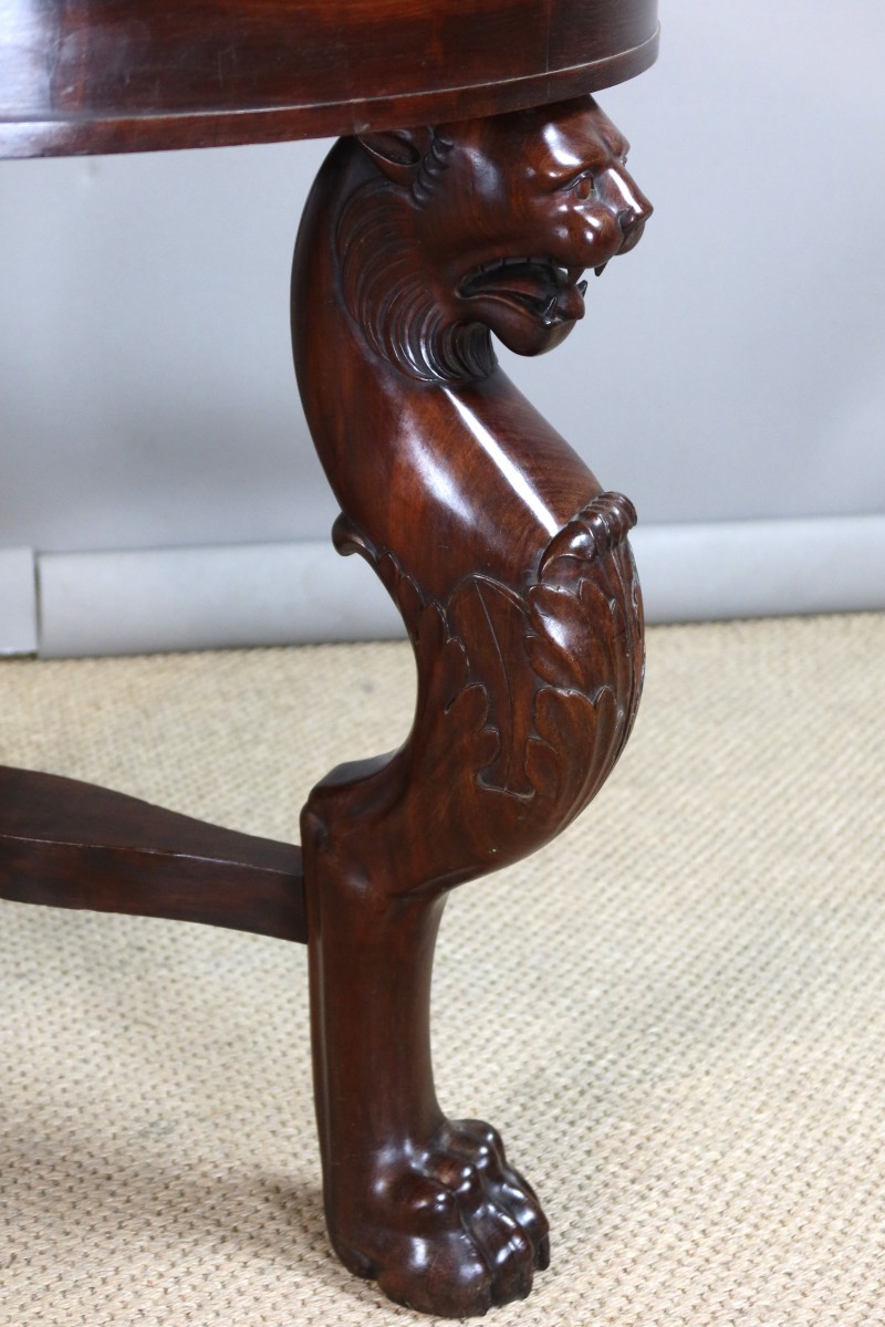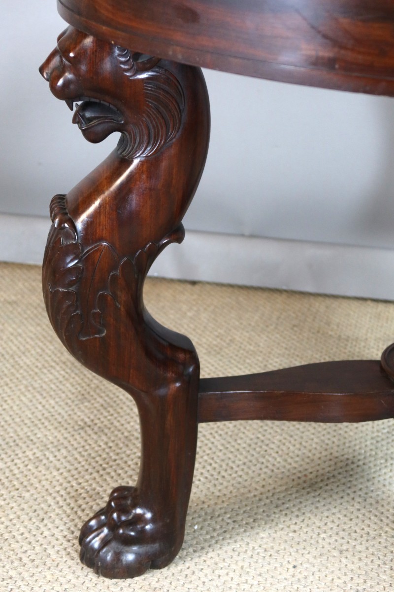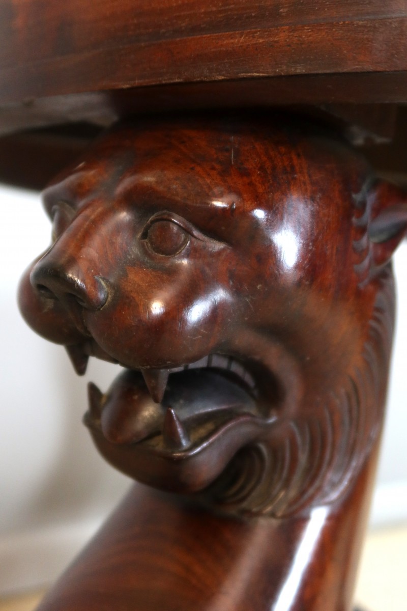 Guéridon d'époque Empire Consulat en acajou massif sculpté aux têtes de lions. Les trois pieds qui se terminent