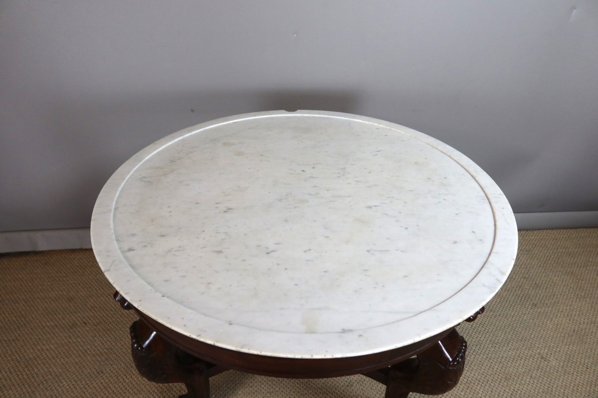 par des griffes sont reliés entre eux par une entretoise. Le plateau est en marbre blanc. Ce guéridon à l'antique