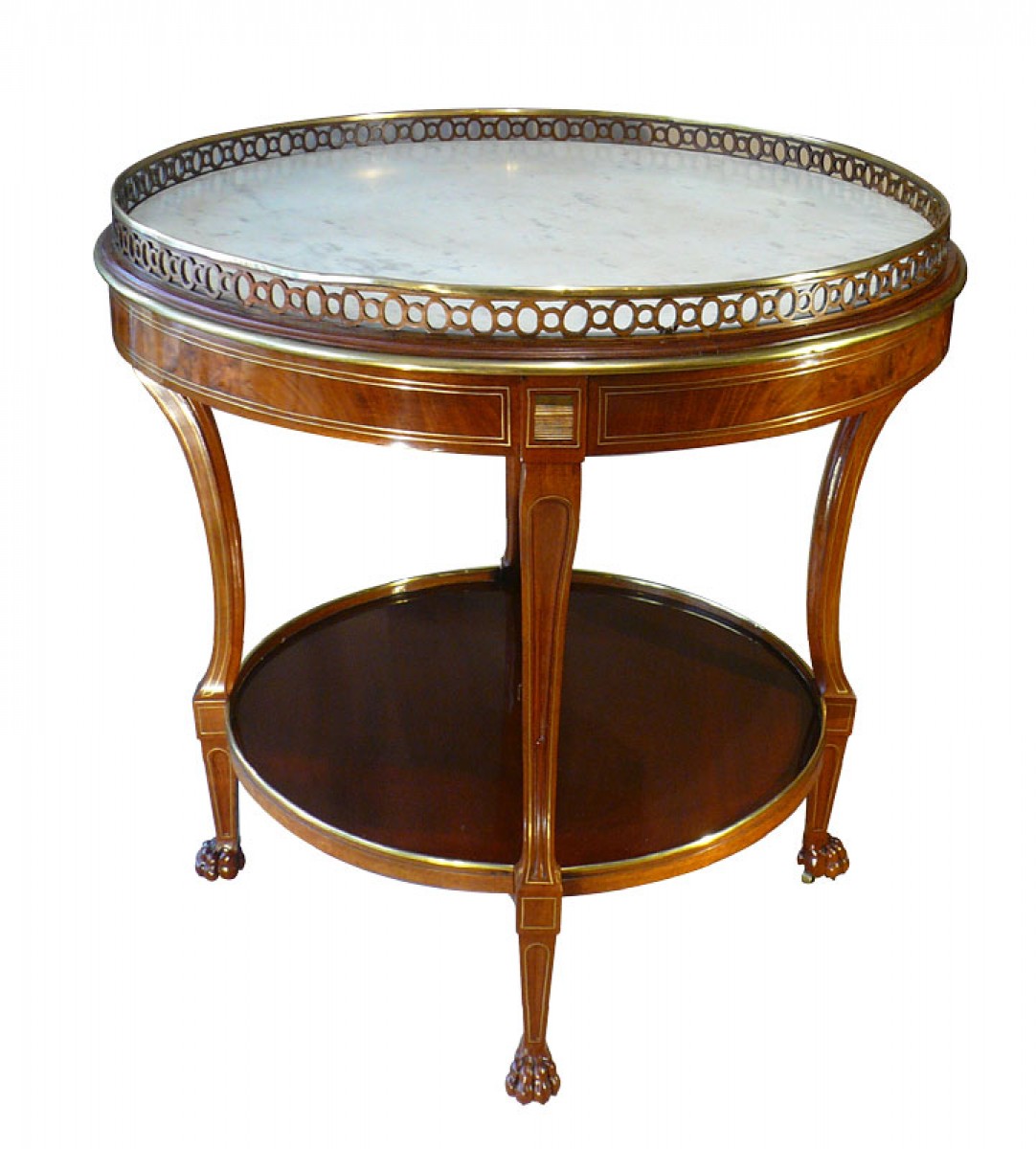 Un remarquable table à thé. Le plateau supérieur circulaire tournant en marbre blanc de Carrare est ceint d’une galerie en retrait.