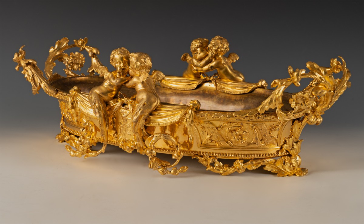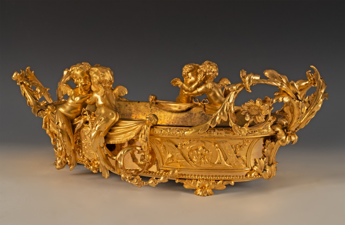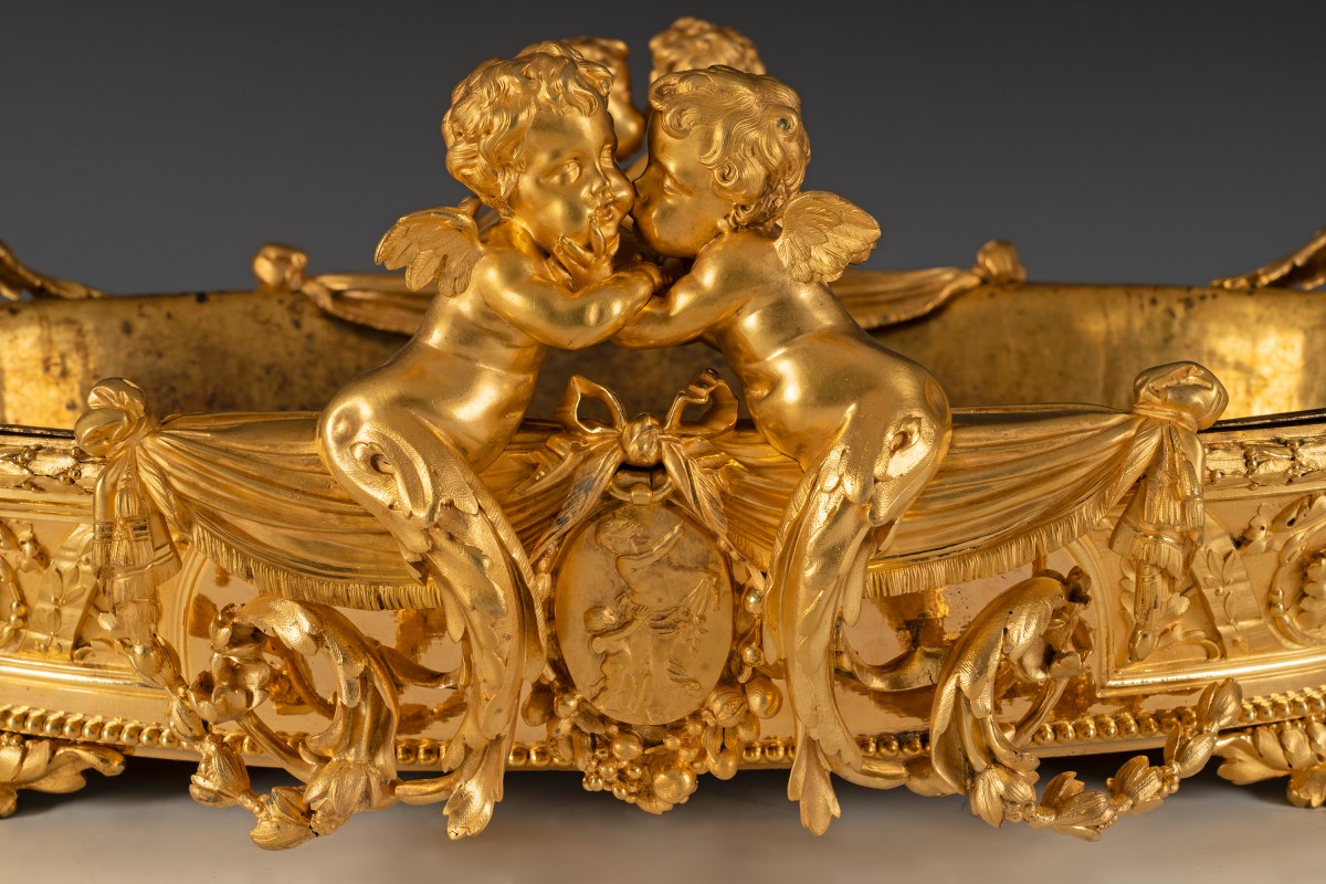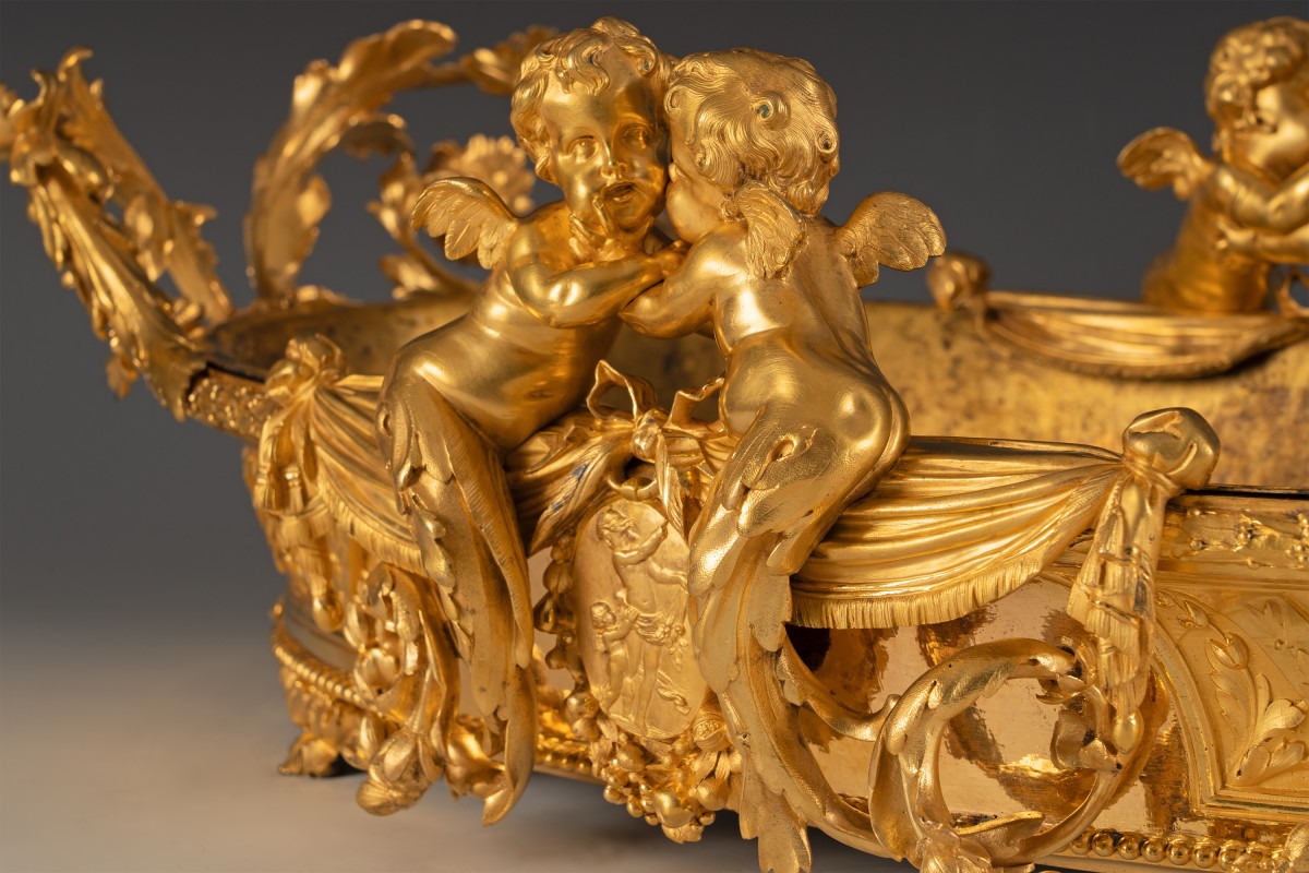 Le thème des amours renvoie à une iconographie d’origine antique, réinterprétée à la Renaissance puis largement diffusée dans les arts décoratifs français. Symbole d’amour, d’abondance ou de félicité domestique, leur présence est particulièrement adaptée à une jardinière, objet associé à la culture des fleurs et à l’ornement des intérieurs bourgeois. Destinée à recevoir des compositions florales, des plantes d’ornement ou de fruits, ces jardinières relevaient d’un mobilier d’apparat, probablement conçue pour un salon ou un boudoir. Elle témoigne du goût pour les pièces spectaculaires, à la fois utilitaires et sculpturales, qui participaient à la mise en scène du luxe domestique.