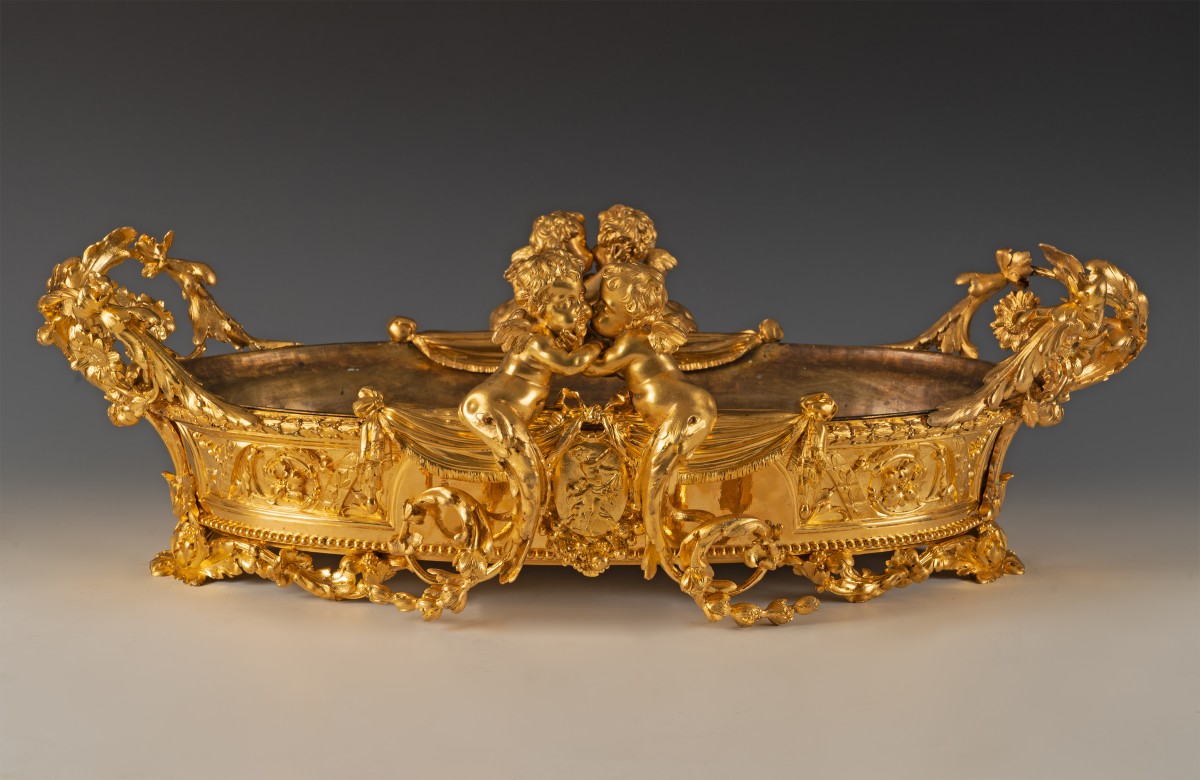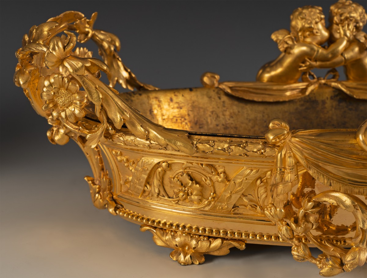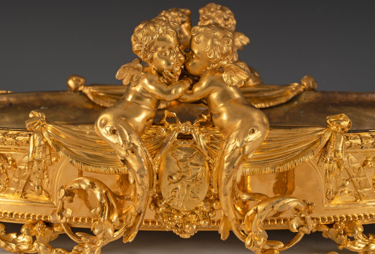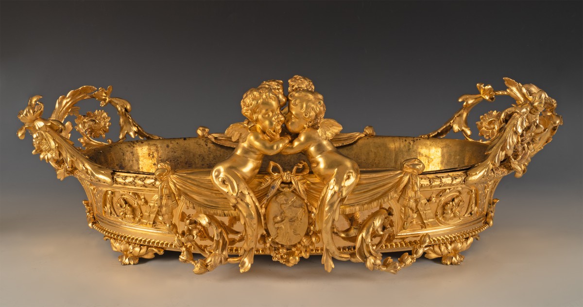 Le thème des amours renvoie à une iconographie d’origine antique, réinterprétée à la Renaissance puis largement diffusée dans les arts décoratifs français. Symbole d’amour, d’abondance ou de félicité domestique, leur présence est particulièrement adaptée à une jardinière, objet associé à la culture des fleurs et à l’ornement des intérieurs bourgeois. Destinée à recevoir des compositions florales, des plantes d’ornement ou de fruits, ces jardinières relevaient d’un mobilier d’apparat, probablement conçue pour un salon ou un boudoir. Elle témoigne du goût pour les pièces spectaculaires, à la fois utilitaires et sculpturales, qui participaient à la mise en scène du luxe domestique.