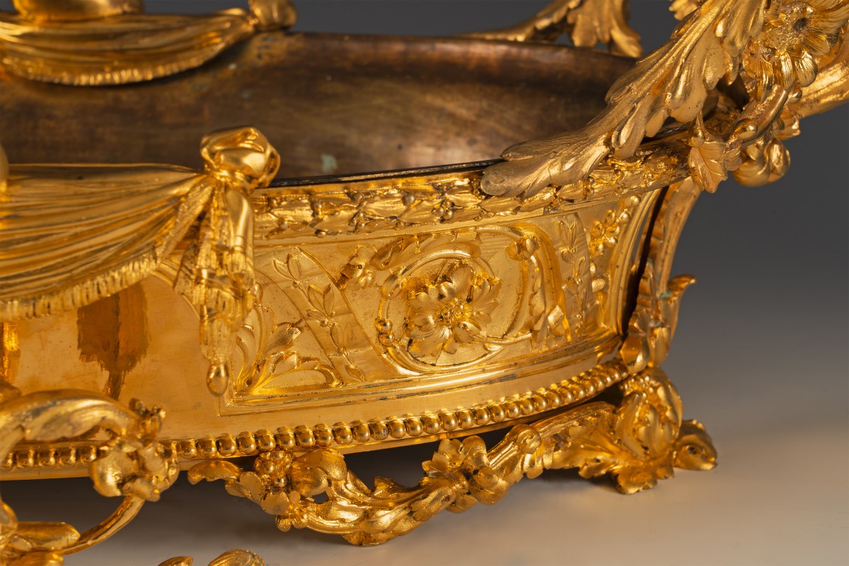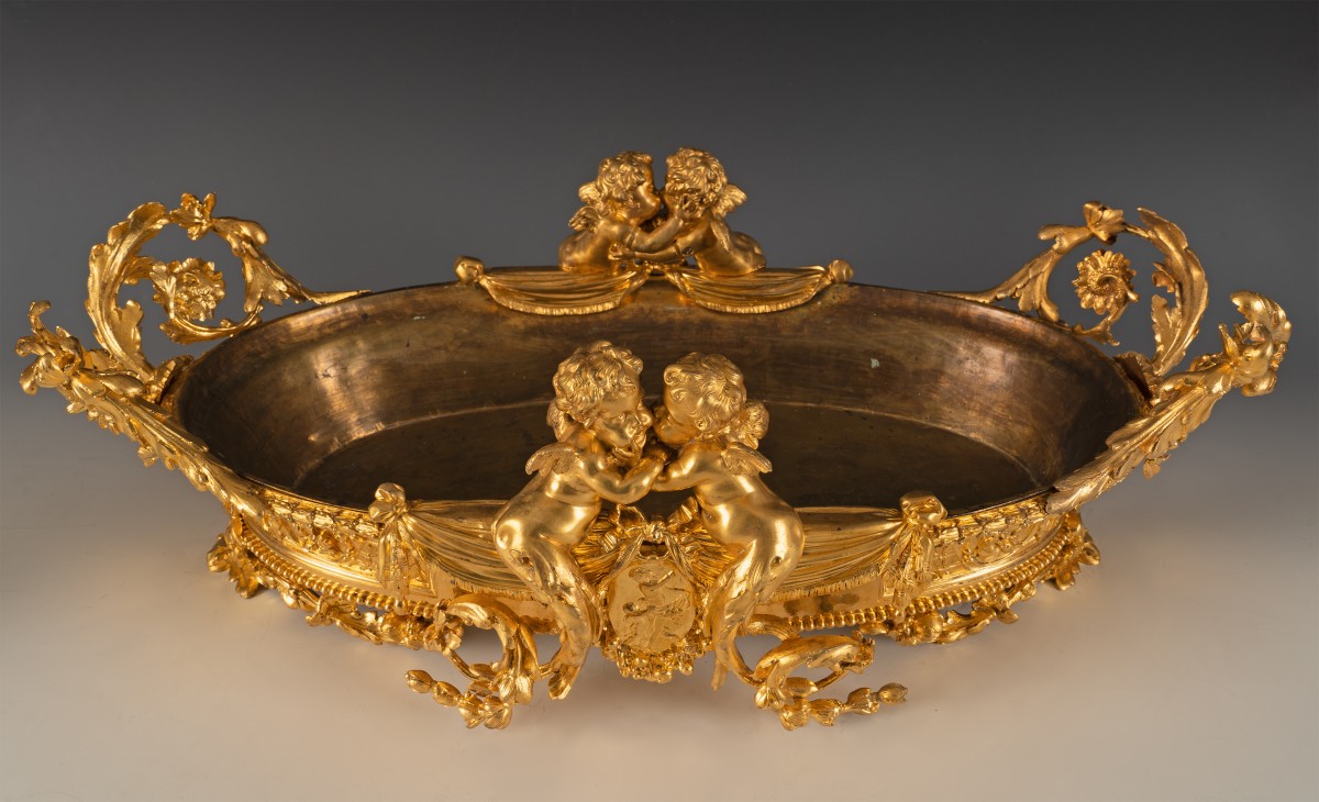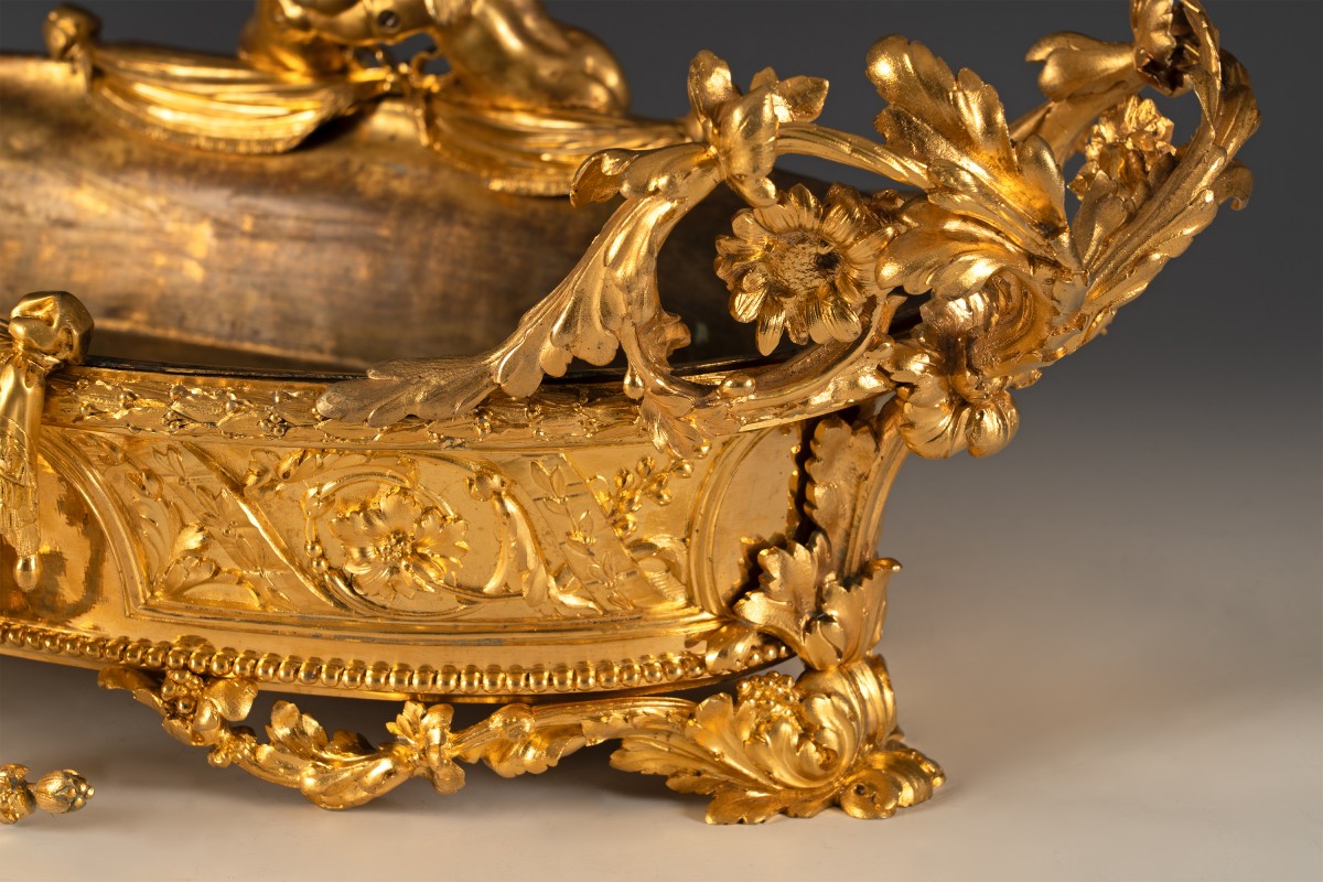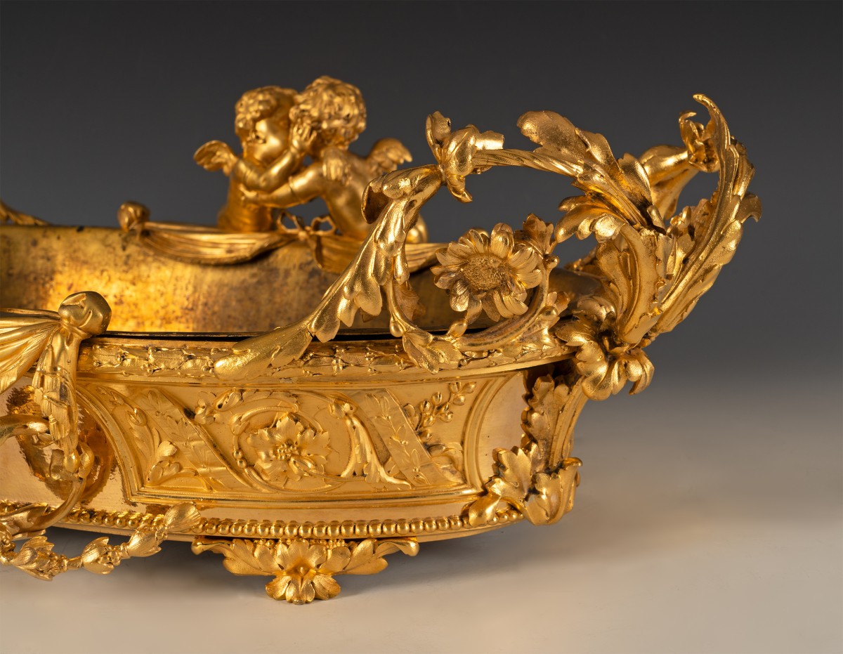 Belle paire de jardinières en bronze ciselé et doré de forme ovale, à doublure intérieure lisse. Elles sont ornées en relief, et mises en valeur par un subtil jeu de bruni et d’amati, de rinceaux feuillagés, enroulements asymétriques, coquilles et agrafes structurant la composition selon un rythme symétrique centré. Au centre se détachent deux amours ailés, traités en ronde-bosse, enlacés dans un geste tendre. Leur modelé souple, chairs pleines, visages aux traits arrondis, chevelures bouclées, témoigne d’une volonté de naturalisme tempérée par l’idéalisation académique. Une seconde paire d’amours, disposée en pendant répètent le même geste. Ils surmontent un médaillon représentant Vénus. Les anses latérales, ajourées et asymétriques, se déploient en larges volutes végétales, peuplées de fleurs et de feuillages, dans un esprit clairement rocaille. Le piètement, formé d’enroulements feuillagés reposant sur de petits appuis discrets, ...