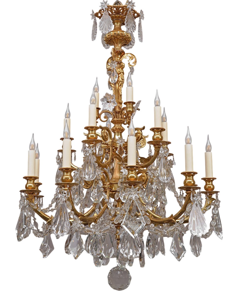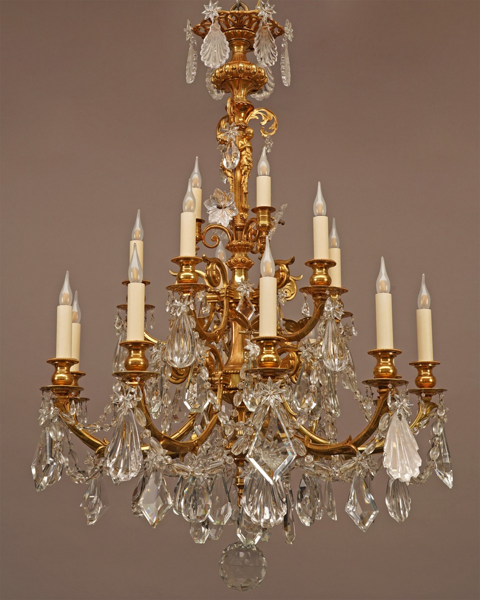 Lustre à dix-huit bras de lumière en bronze doré attribué à H. Vian, richement orné de volutes, de perles et de pampilles en cristal taillé. L’ensemble est agrémenté sur le fût de trois figures féminines formant cariatides et de papillons en bronze doré sur les branches. En partie basse, une boule facettée décore l’ensemble.