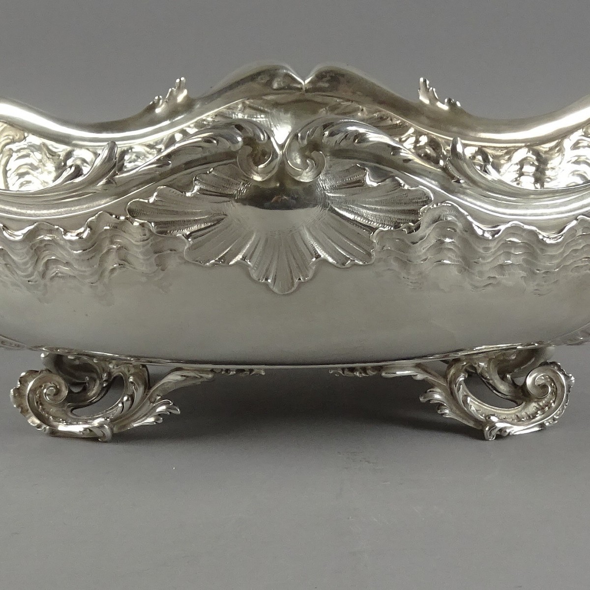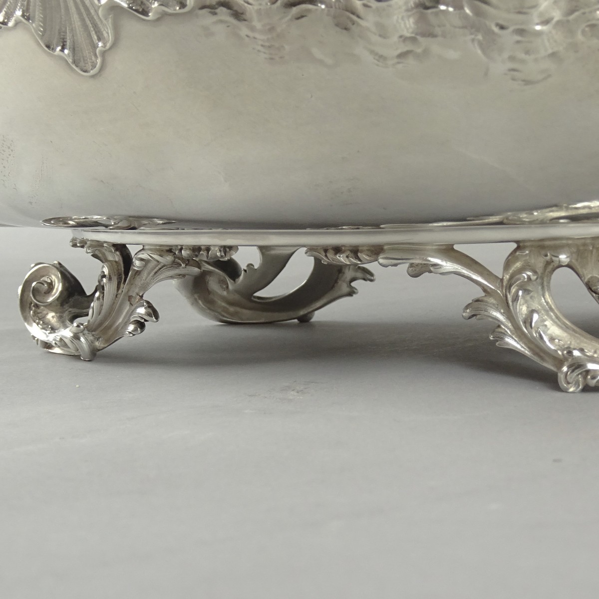 Jardinière en argent massif, de forme ovale, elle repose sur quatre pieds à enroulements ajourés
