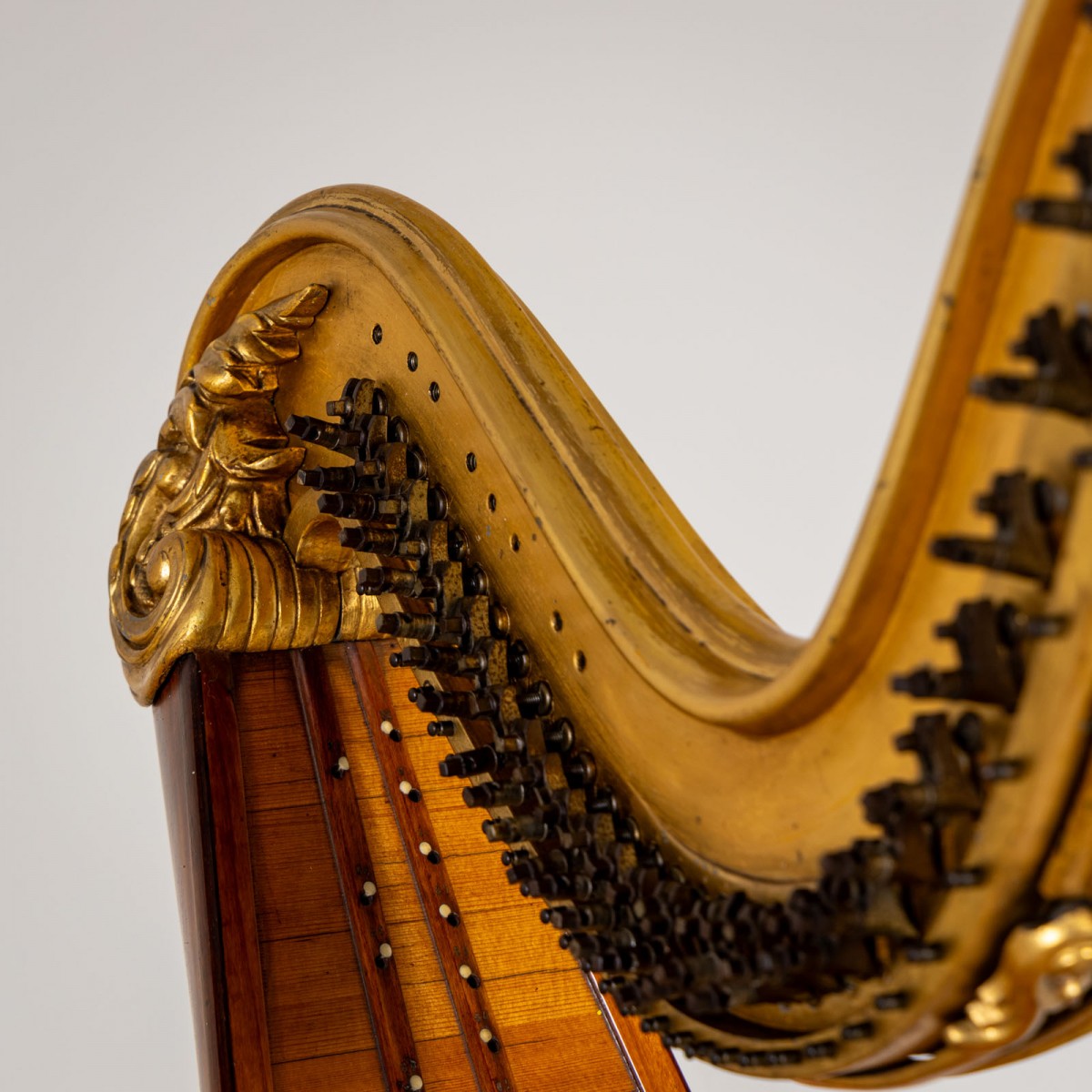 Grande harpe double avec tête et cou à patine dorée et pieds sculptés en forme de griffes sur la base. La harpe est marquée sur le cou "Pleyel, Lyion & Cie (Paris). Harp, sysle. Gve Lyon. Brevete. No. 367". Le pilier et le corps sont en acajou. Quelques cordes sont manquantes. Le monogramme WP peut être trouvé sur l'envers du cou.
