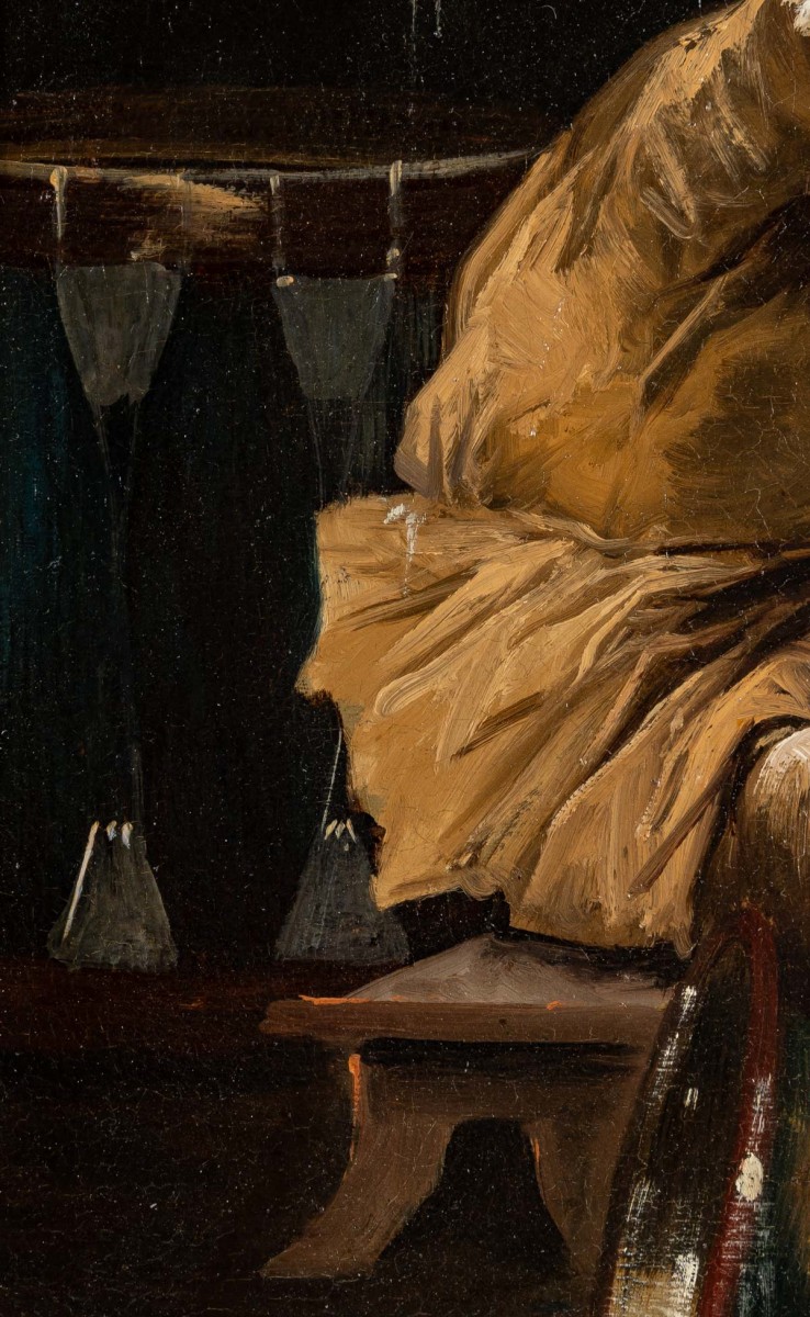 En très bon état de conservation, ce tableau a fait l’objet d’une restauration et d’un nettoyage professionnels. Il est mis en valeur par un cadre en bois et stuc doré, qui souligne son charme et son élégance.