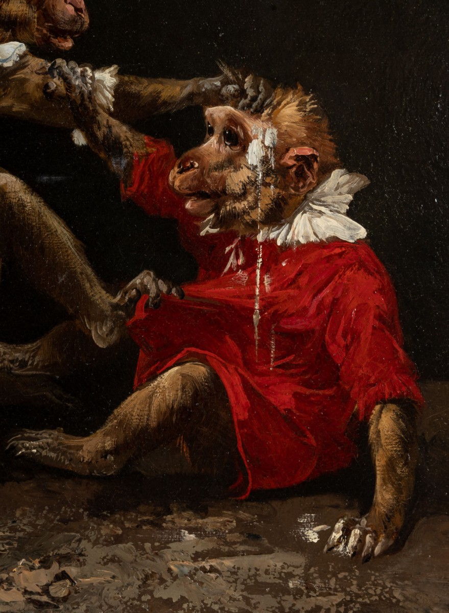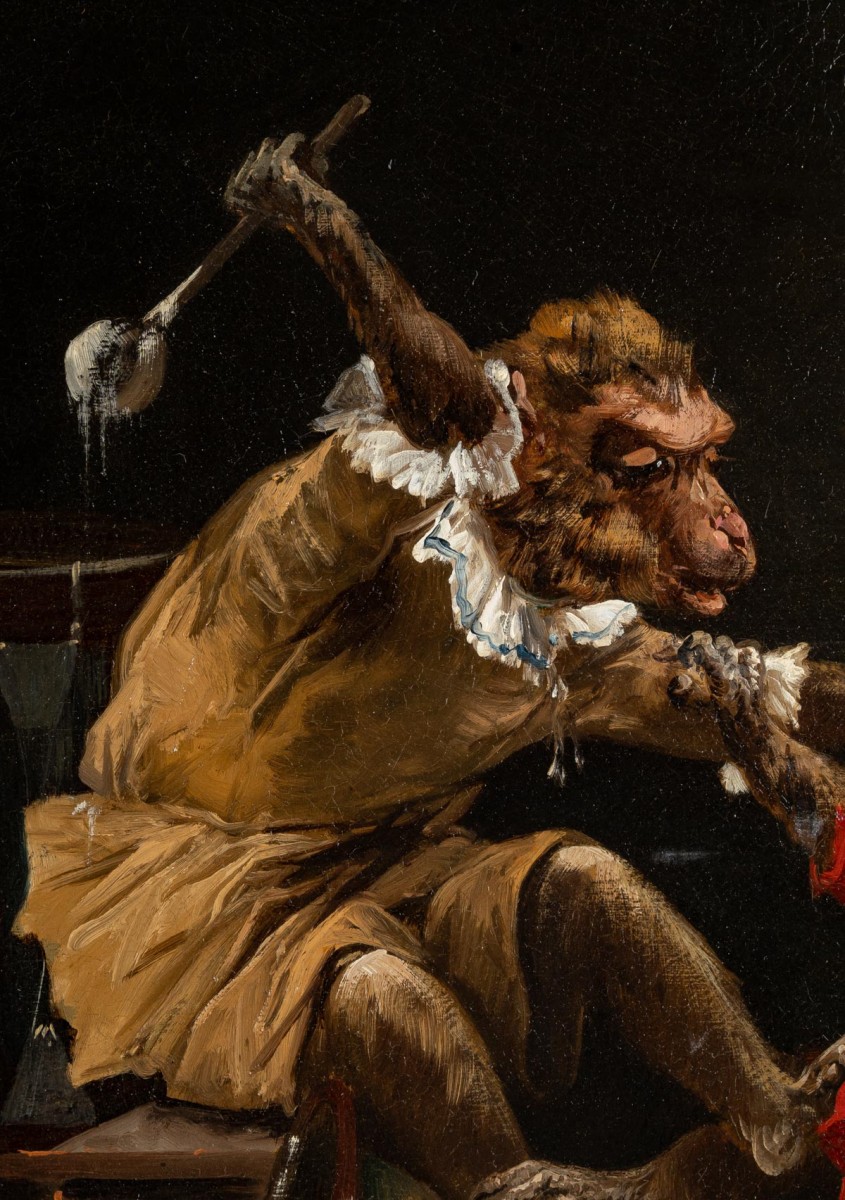 Avec humour et vivacité, Henry Schouten nous offre une scène de singerie pleine d’entrain : sur une piste de cirque, un couple de singes s’amuse à se lancer des boules de glace à la tête. L’œuvre, signée en bas à droite et datée des alentours de 1890, allie finesse d’exécution et esprit malicieux.