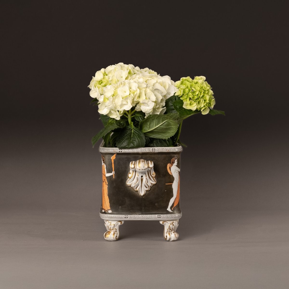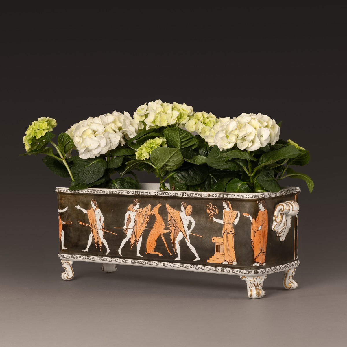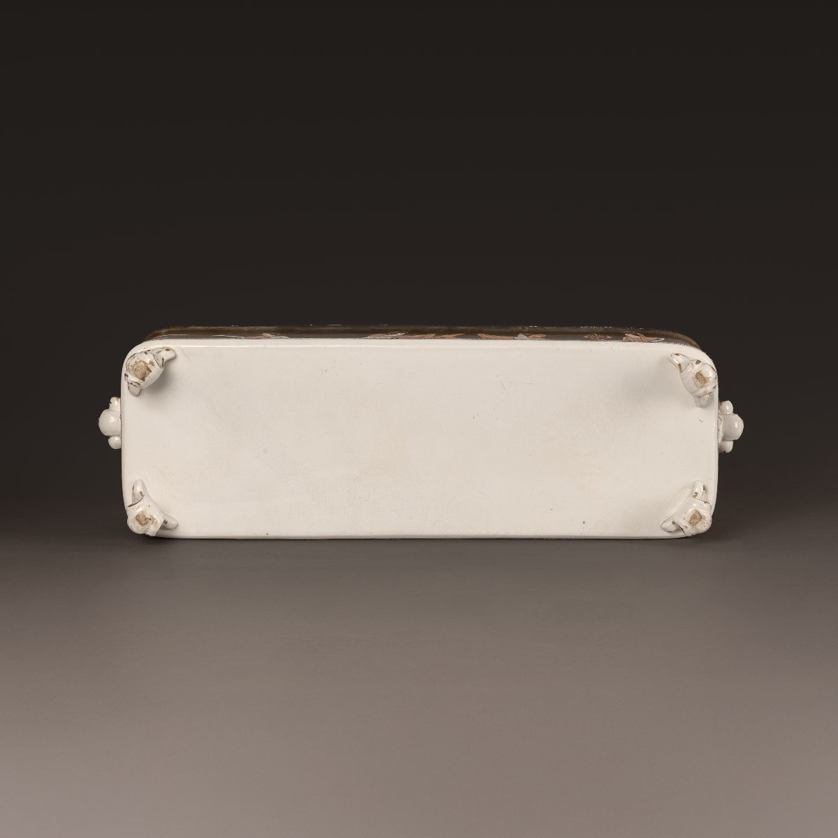 Très importante pièce de faïence, de forme parallélépipédique, reposant sur quatre pieds aux angles. Décor de figures rouges sur fond noir, avec deux scènes, une sur chaque face, tirées du recueil de Pierre d’Hancarville, "Collection des antiquités grecques, étrusques et romaines, du cabinet de Sir William Hamilton'', volume III, 1767.